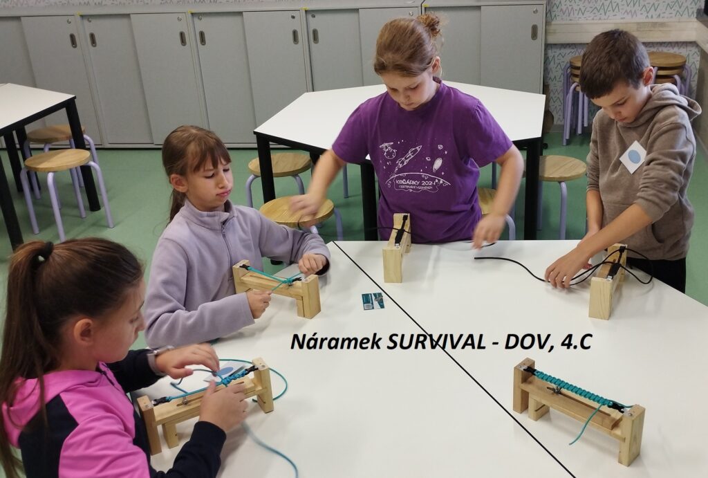 V druhém programu si žáci vyzkoušeli tvorbu paracordového náramku — nejen jako módní doplněk, ale jako praktickou pomůcku pro přežití. Pod vedením lektorky se učili techniky pletení a uzlování na dřevěném rámu — rozvíjeli manuální zručnost a kreativitu. Každý si pak odnesl svůj vlastní hotový náramek. Program je úžasným příkladem toho, jak spojit techniku, tvořivost a užitečnost — děti si uvědomily, že i jednoduchý předmět může mít smysl a hodnotu.