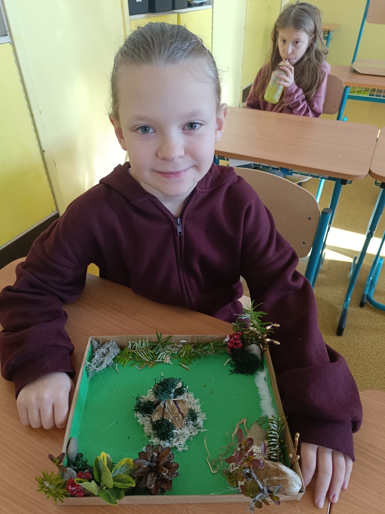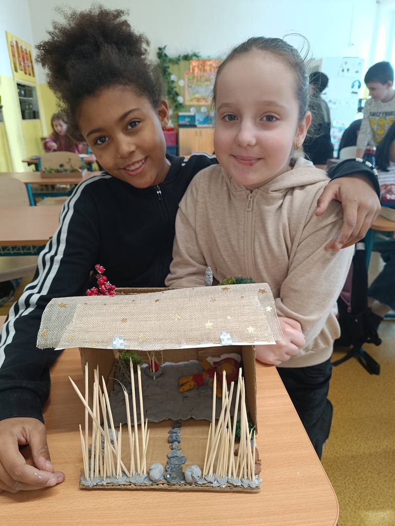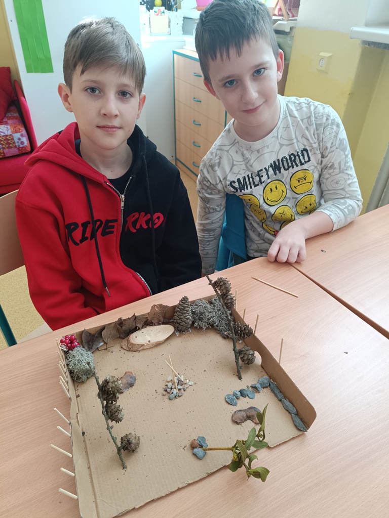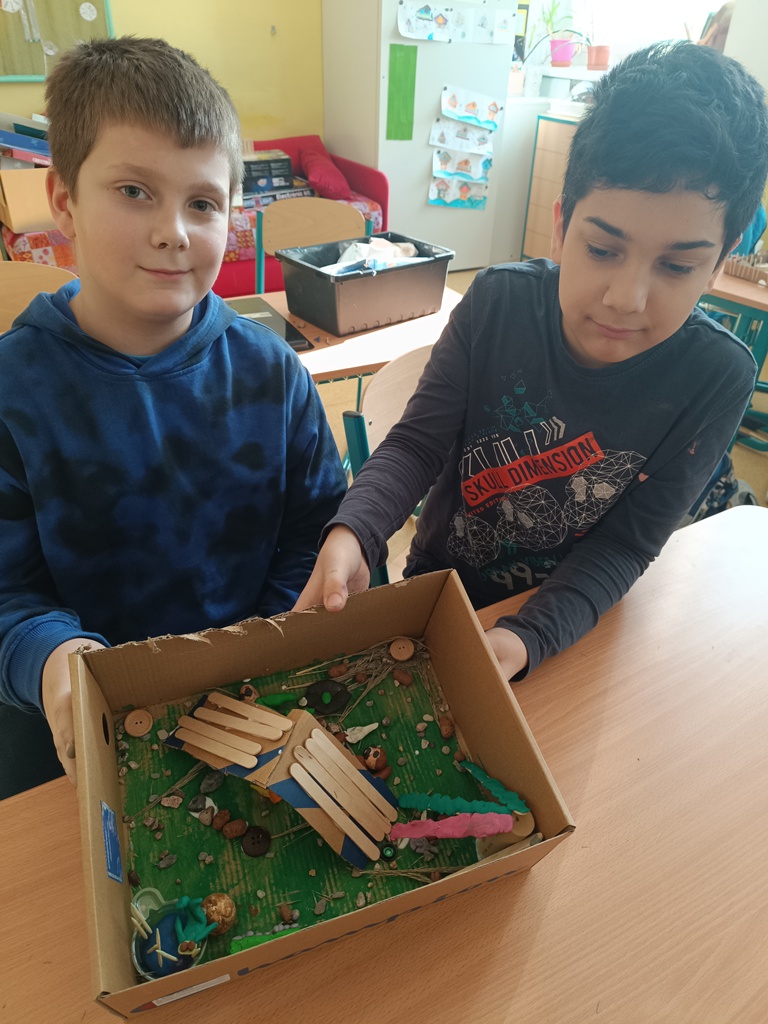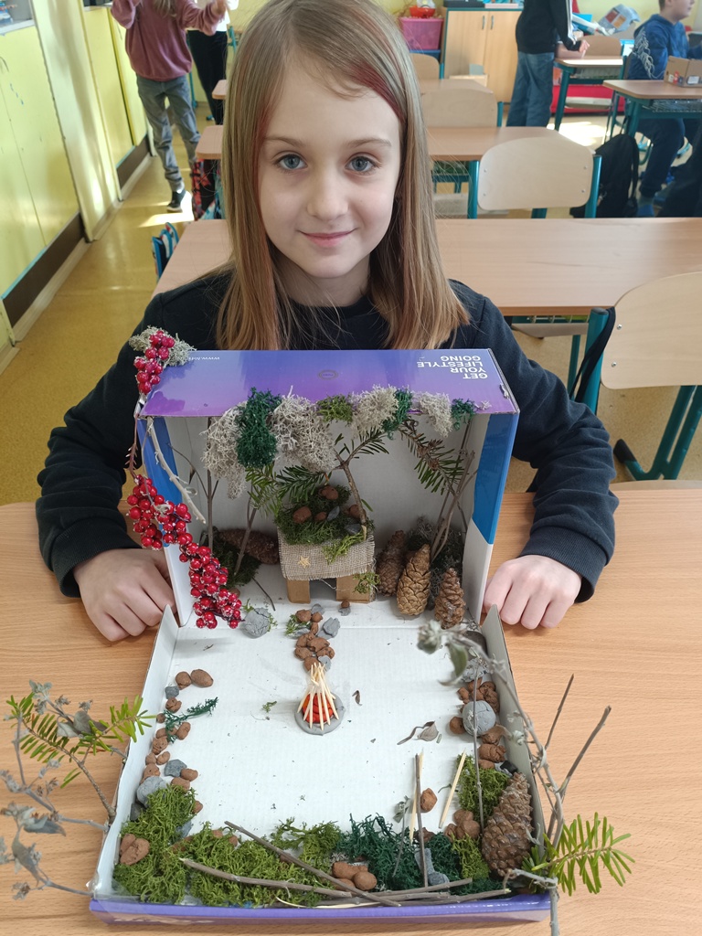 Děti pracovaly s velkým nadšením, kreativitou i trpělivostí a výsledkem je vesnice, která vypadá, jako by se v ní za chvíli měl rozhořet oheň a vrátit se lovci z výpravy.