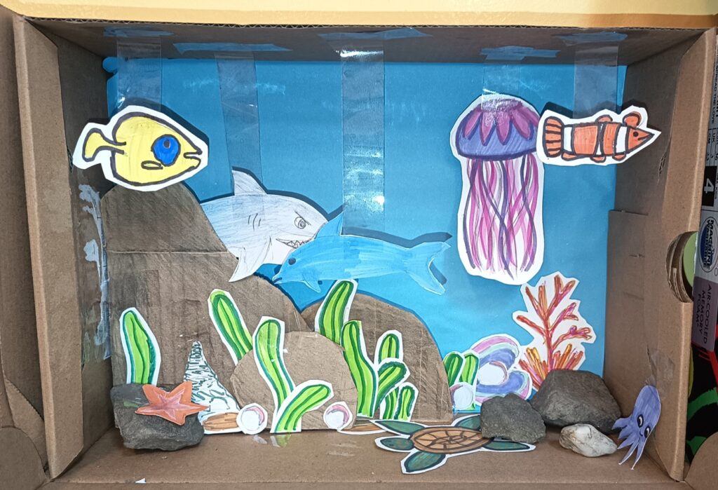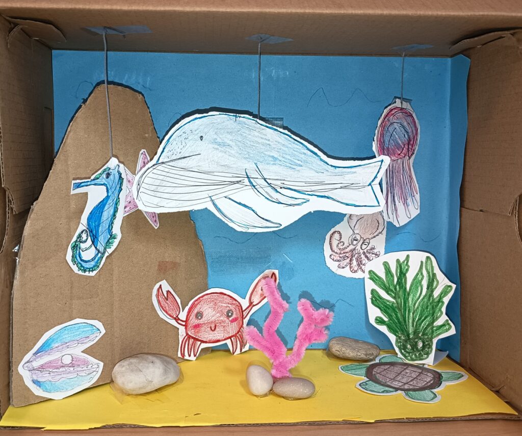 Na závěr tematického bloku si žáci vytvořili své malé oceány, ve kterých umístili různé mořské živočichy. Pomocí angličtiny pak jednotlivé živočichy představili a popsali jejich vlastnosti.