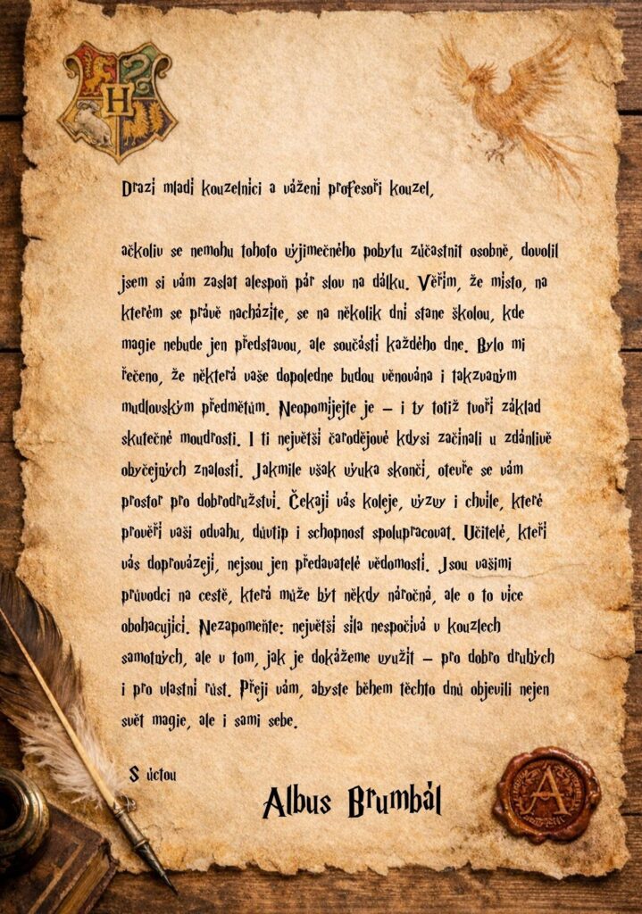 Po vydatné večeři přišel večerní program. Ten začal tím, co se v žádné kouzelnické škole nevynechává – seznámením s řádem pobytu, pravidly bezpečnosti a základními zásadami, které budou všechny provázet celým dobrodružstvím. A právě v tu chvíli dorazila první kouzelnická zpráva.