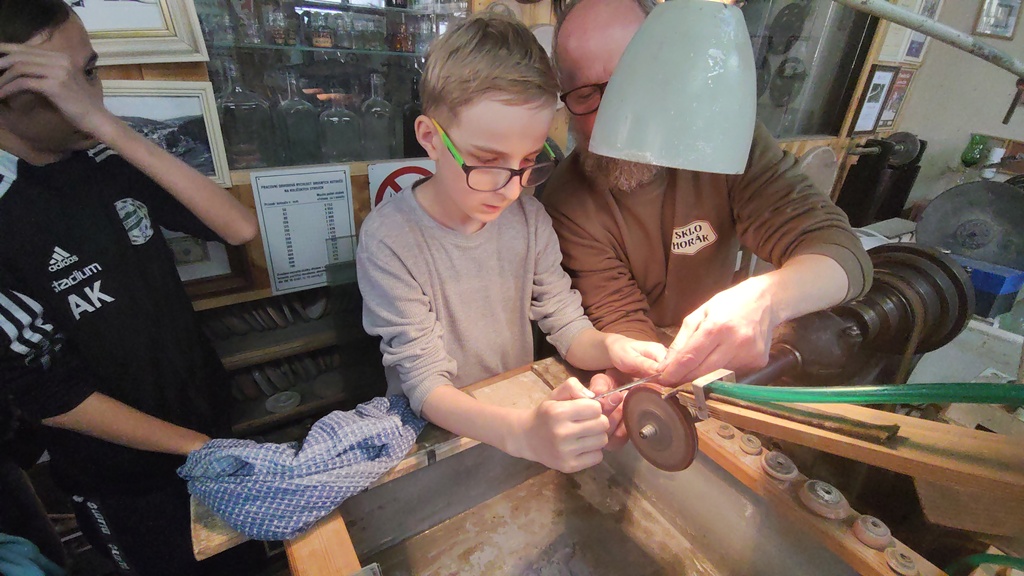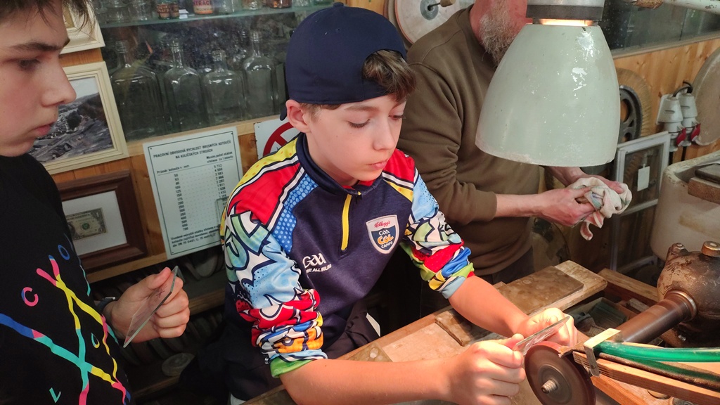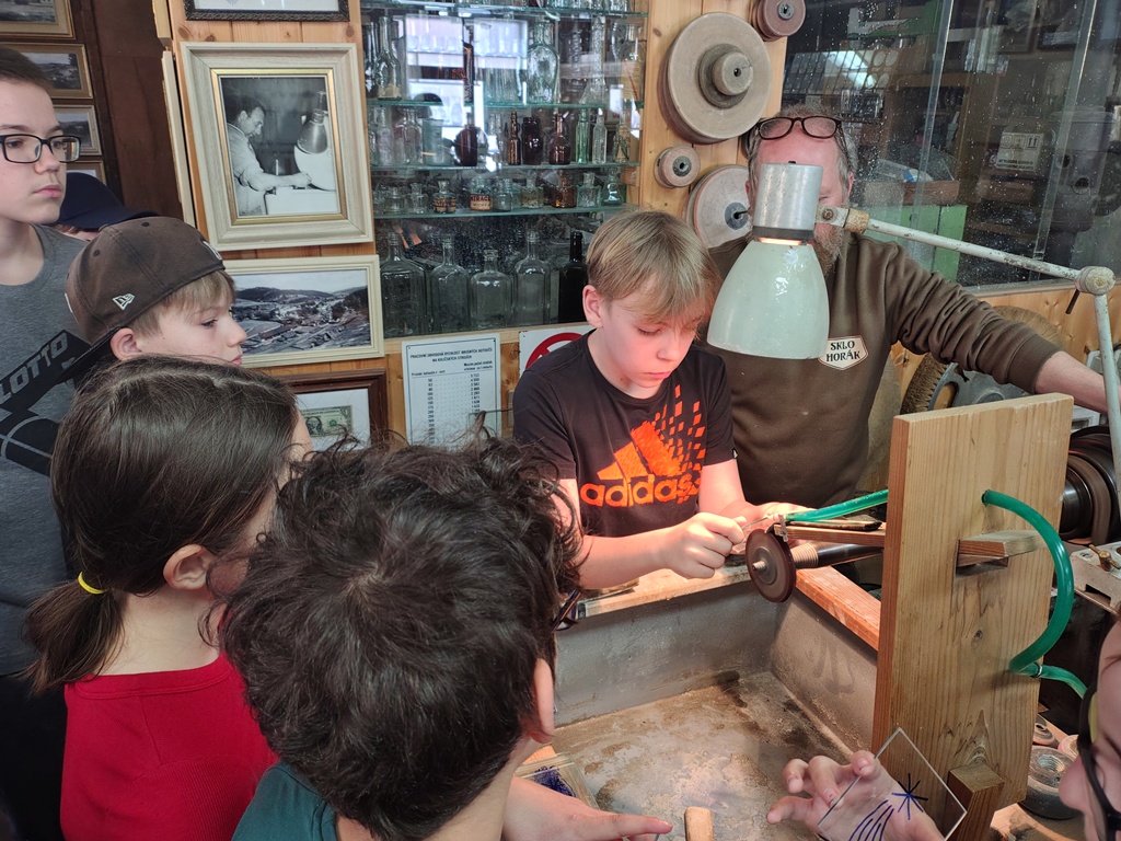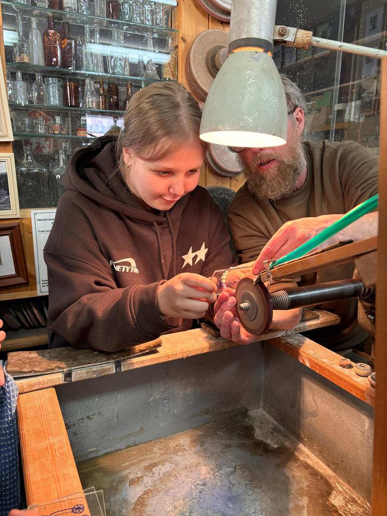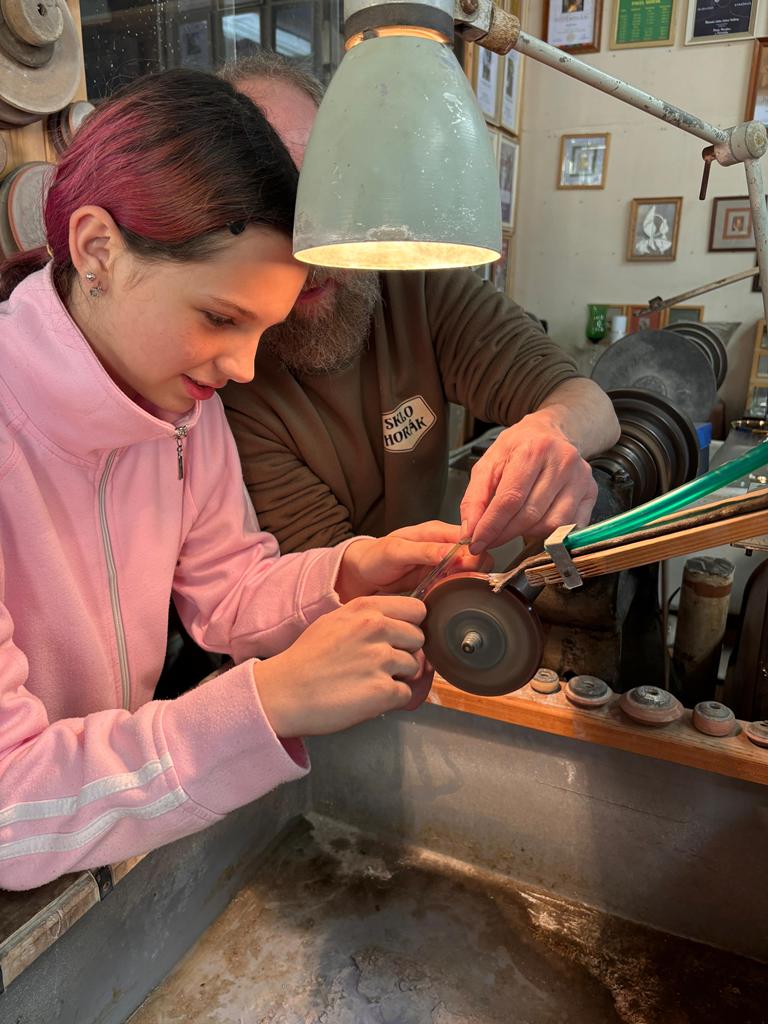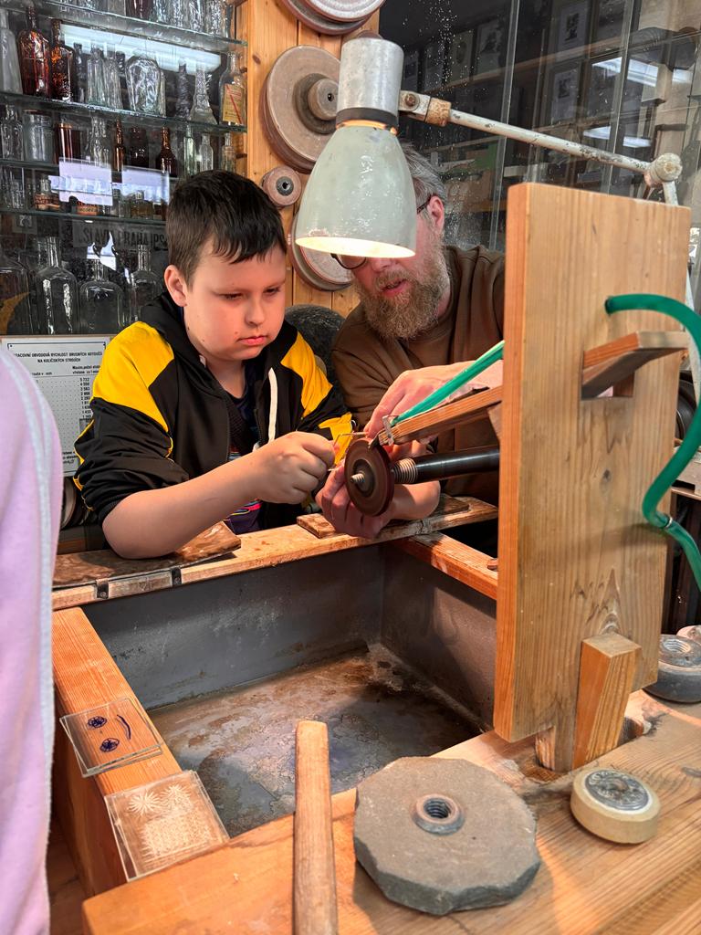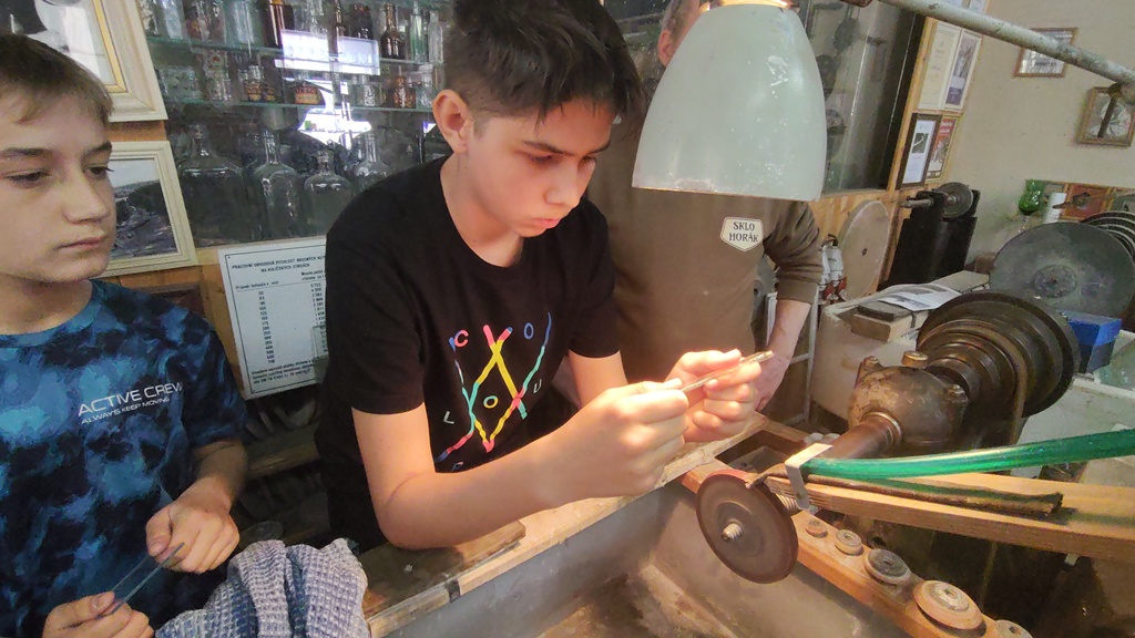 Vrcholným zážitkem se pak stalo setkání s mistrem brusičem, panem Horákem. Během přibližně hodiny a půl měli žáci jedinečnou možnost nahlédnout přímo pod ruce zkušeného řemeslníka a dokonce si sami vyzkoušet náročnou techniku broušení skla. Dozvěděli se mnoho nových informací, ale především si „osahali“ poctivou práci, která vyžaduje trpělivost, přesnost a cit.