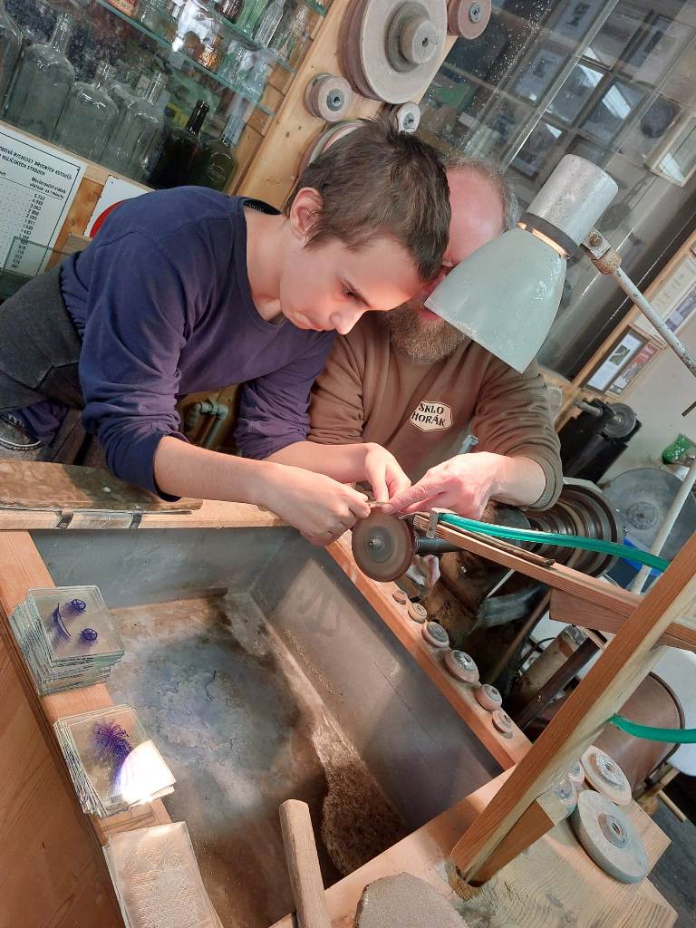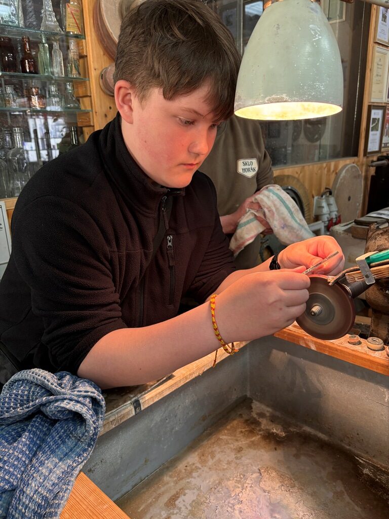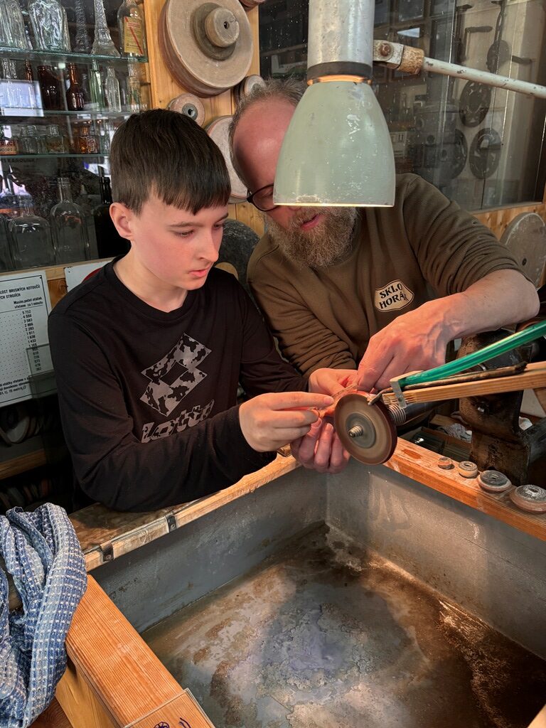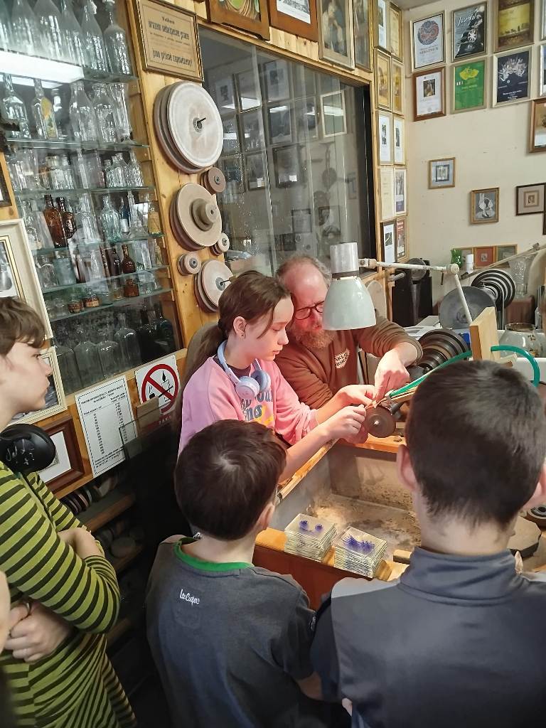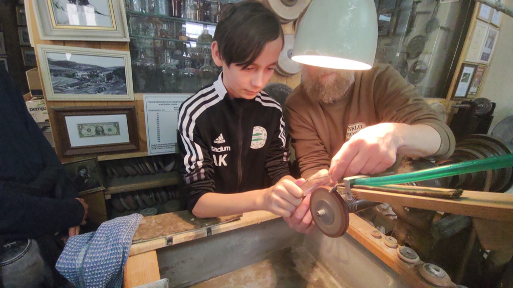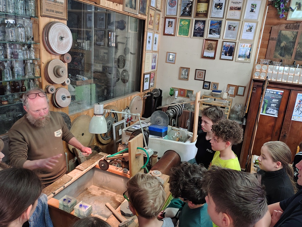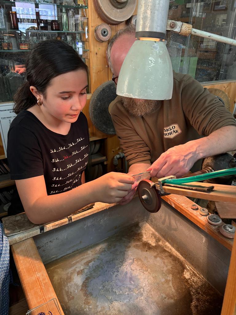 Vrcholným zážitkem se pak stalo setkání s mistrem brusičem, panem Horákem. Během přibližně hodiny a půl měli žáci jedinečnou možnost nahlédnout přímo pod ruce zkušeného řemeslníka a dokonce si sami vyzkoušet náročnou techniku broušení skla. Dozvěděli se mnoho nových informací, ale především si „osahali“ poctivou práci, která vyžaduje trpělivost, přesnost a cit.