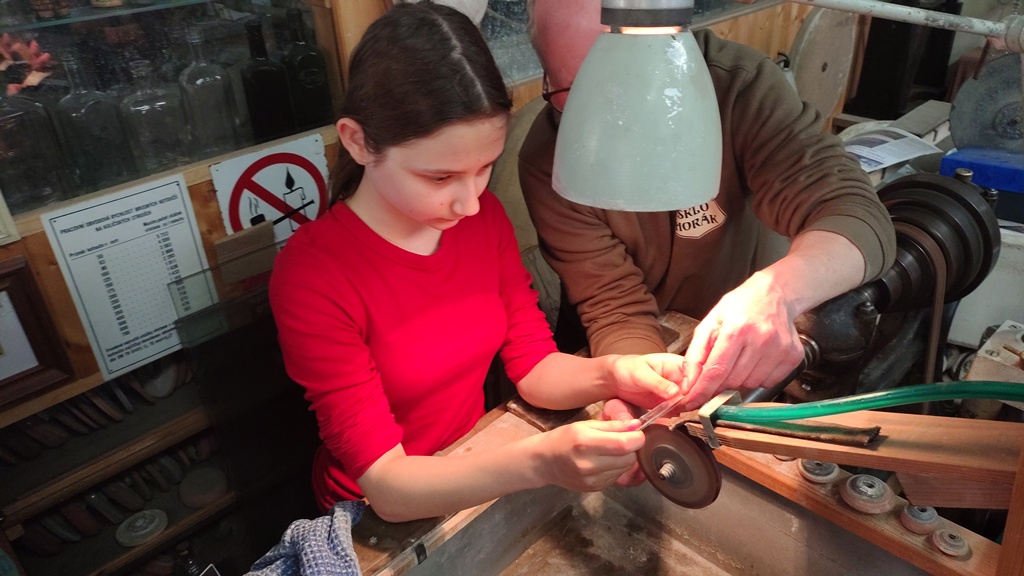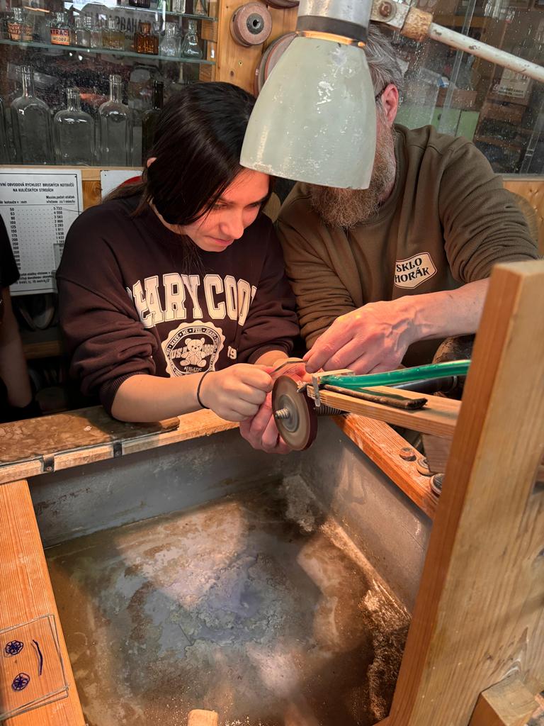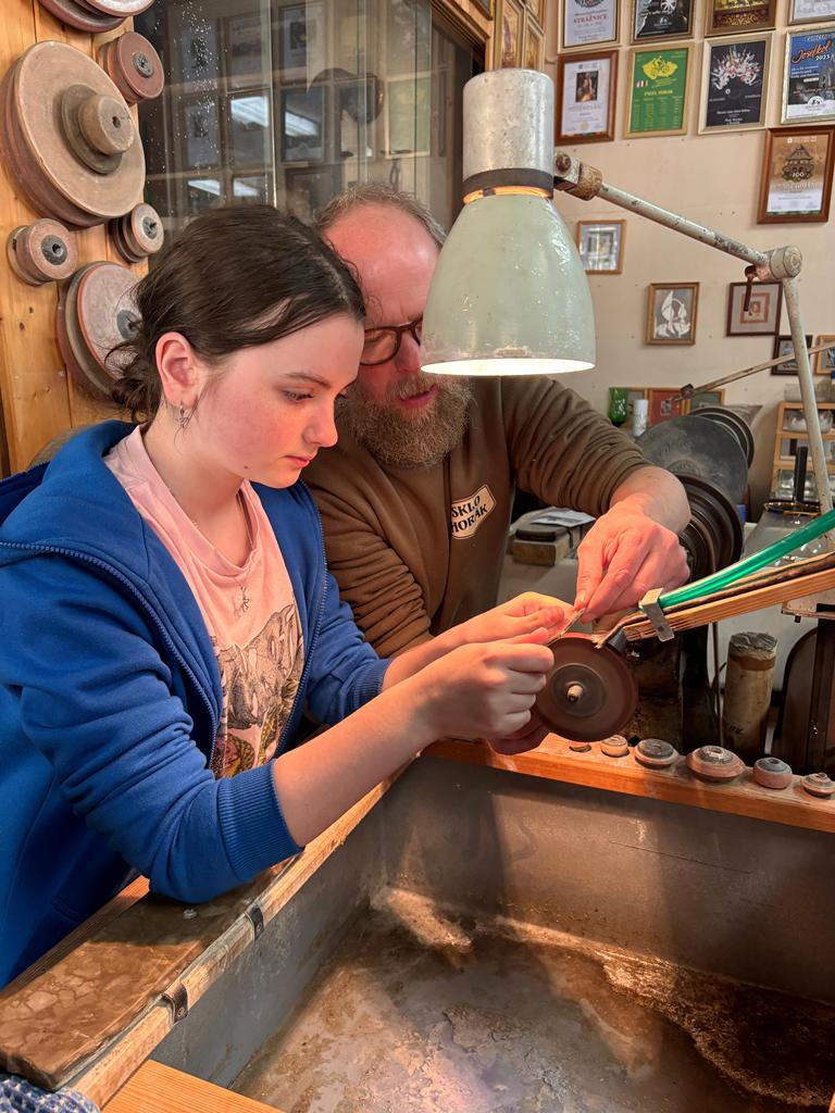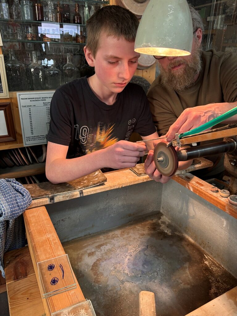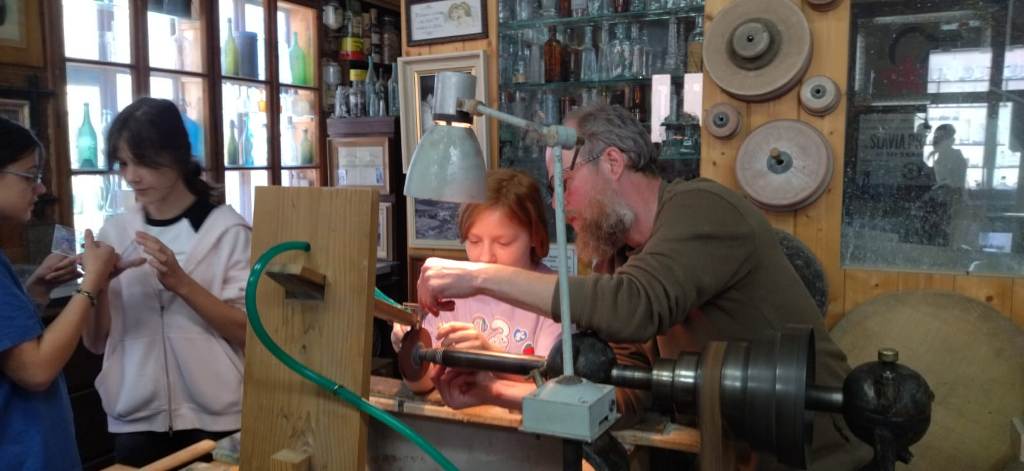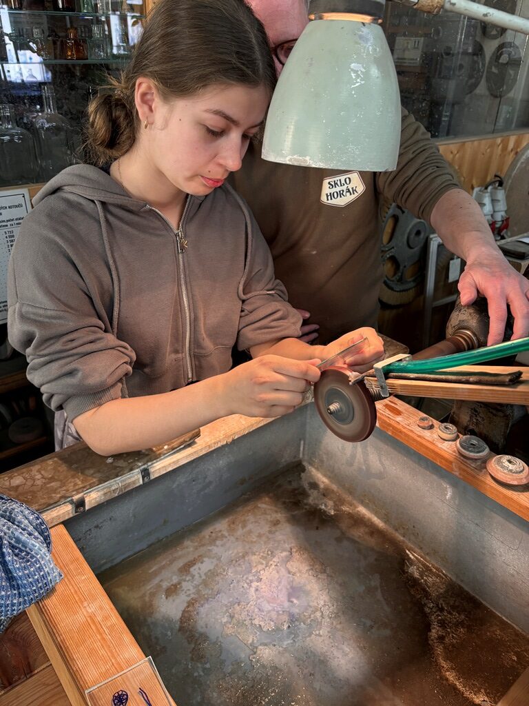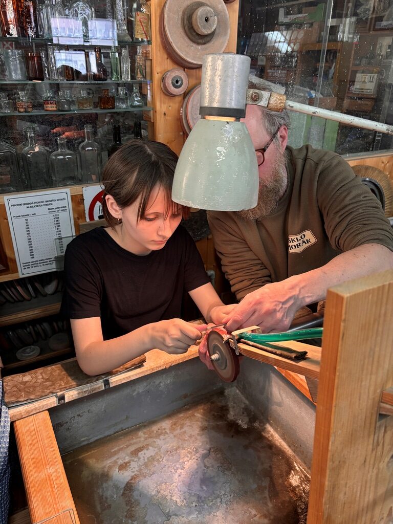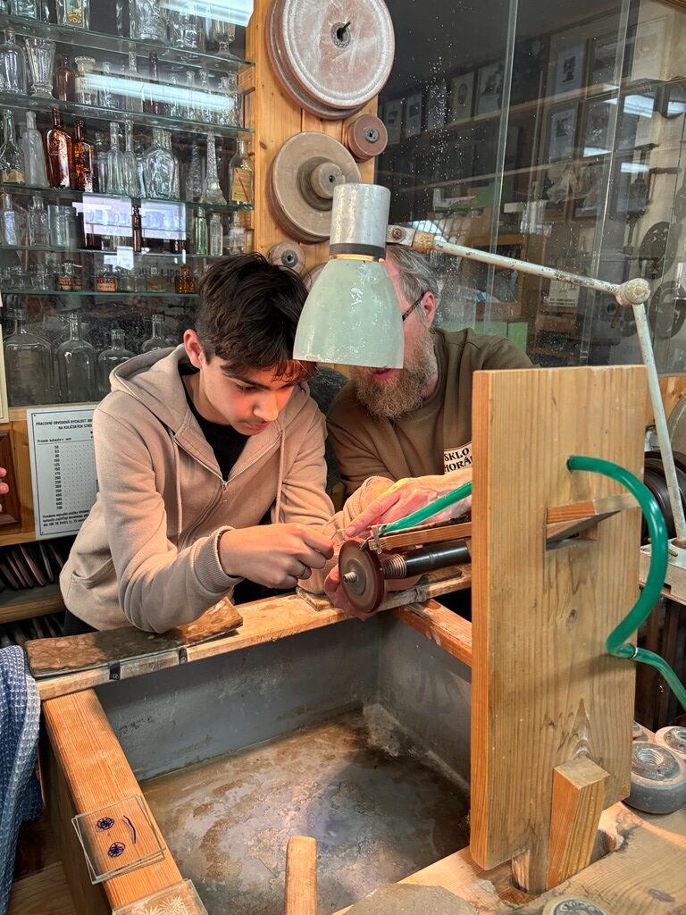 Vrcholným zážitkem se pak stalo setkání s mistrem brusičem, panem Horákem. Během přibližně hodiny a půl měli žáci jedinečnou možnost nahlédnout přímo pod ruce zkušeného řemeslníka a dokonce si sami vyzkoušet náročnou techniku broušení skla. Dozvěděli se mnoho nových informací, ale především si „osahali“ poctivou práci, která vyžaduje trpělivost, přesnost a cit.
