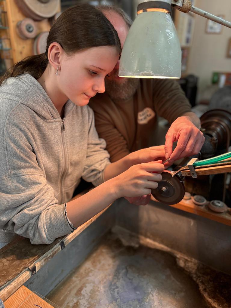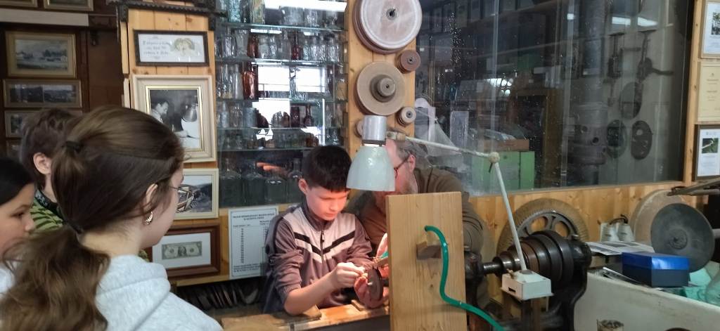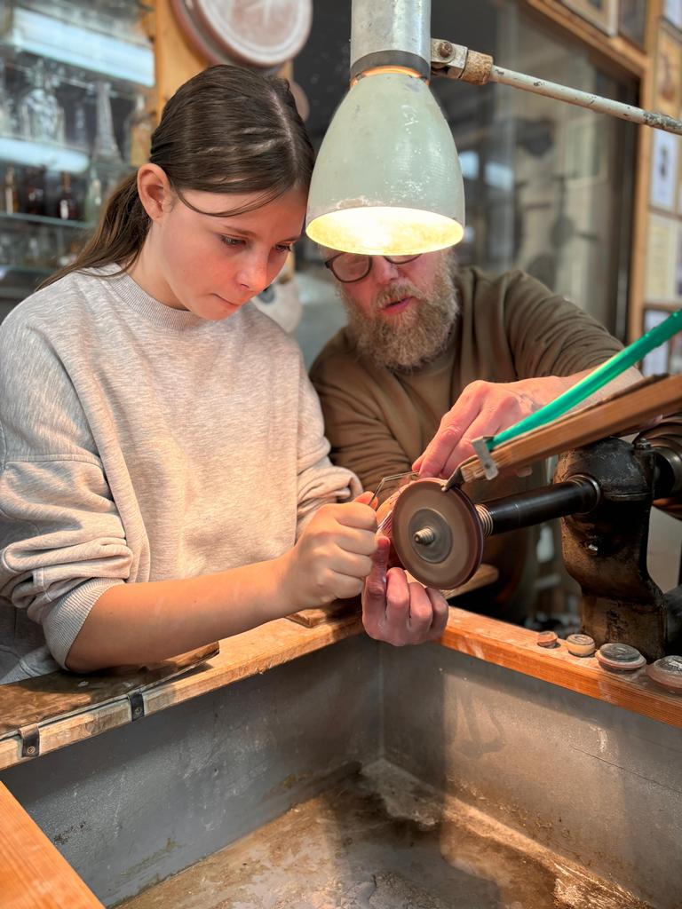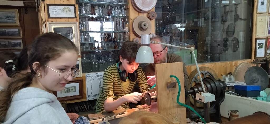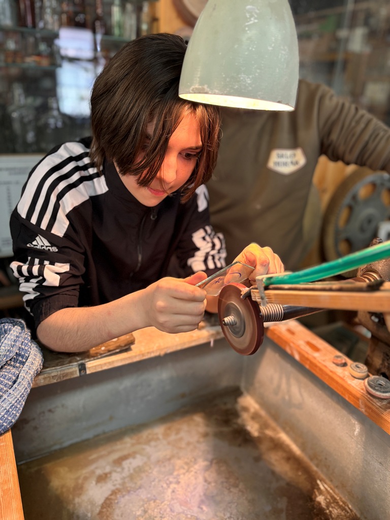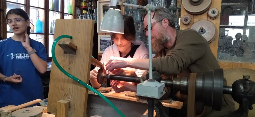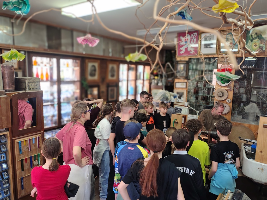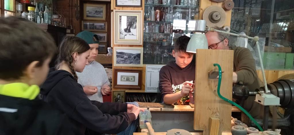 Vrcholným zážitkem se pak stalo setkání s mistrem brusičem, panem Horákem. Během přibližně hodiny a půl měli žáci jedinečnou možnost nahlédnout přímo pod ruce zkušeného řemeslníka a dokonce si sami vyzkoušet náročnou techniku broušení skla. Dozvěděli se mnoho nových informací, ale především si „osahali“ poctivou práci, která vyžaduje trpělivost, přesnost a cit.