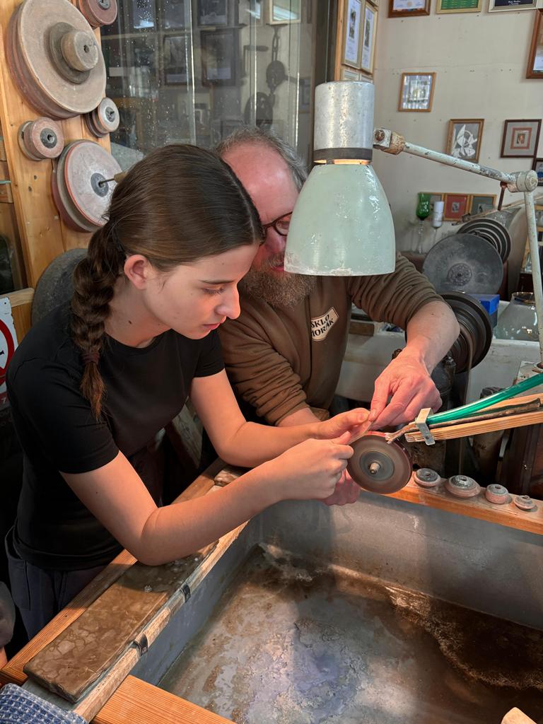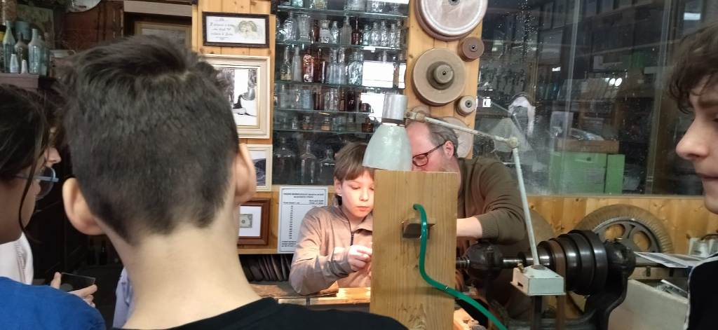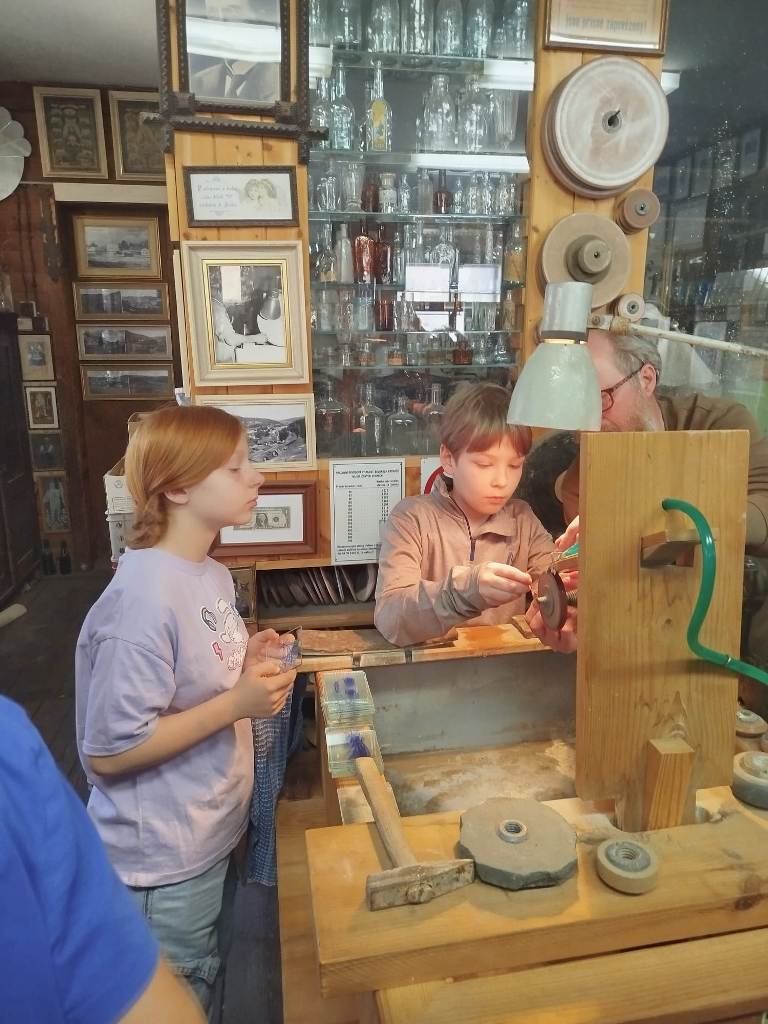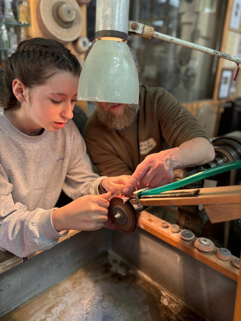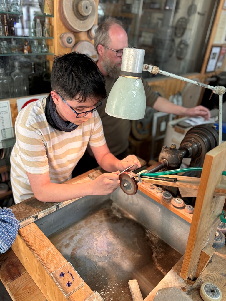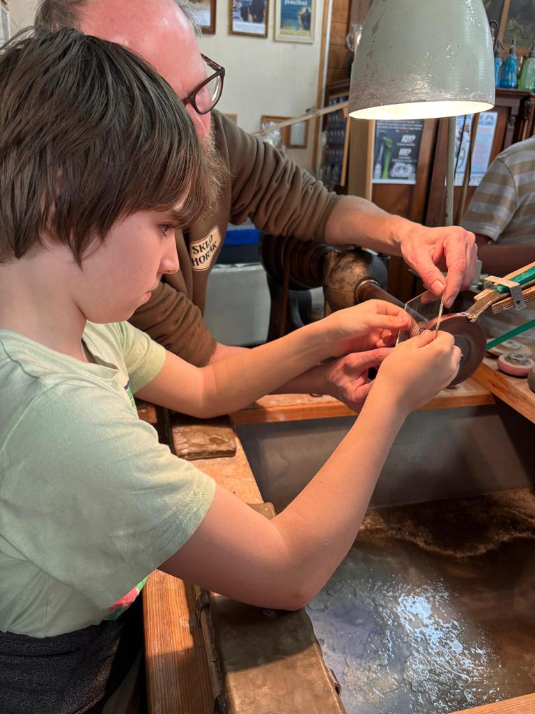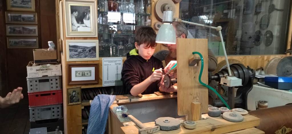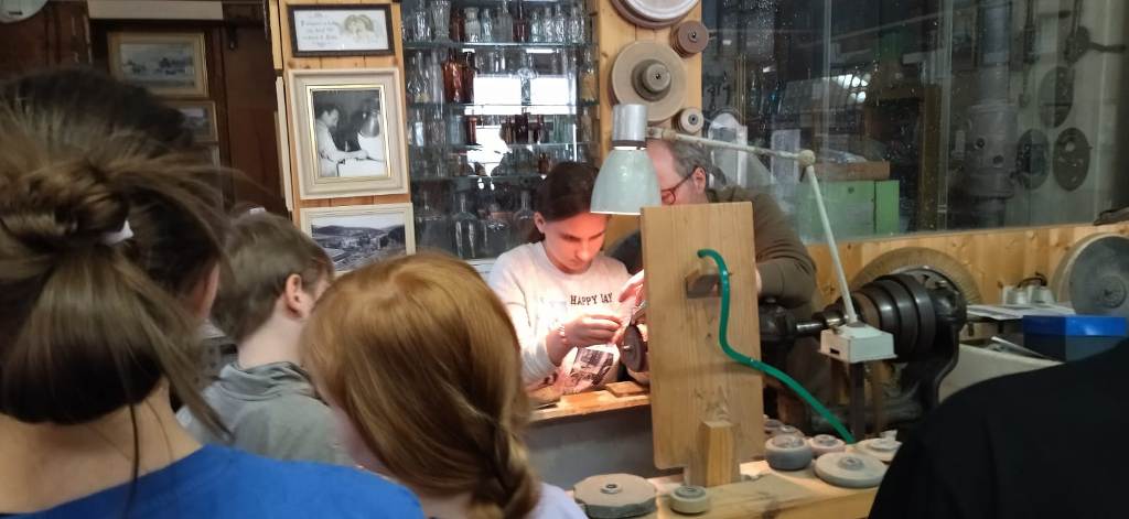 Vrcholným zážitkem se pak stalo setkání s mistrem brusičem, panem Horákem. Během přibližně hodiny a půl měli žáci jedinečnou možnost nahlédnout přímo pod ruce zkušeného řemeslníka a dokonce si sami vyzkoušet náročnou techniku broušení skla. Dozvěděli se mnoho nových informací, ale především si „osahali“ poctivou práci, která vyžaduje trpělivost, přesnost a cit.