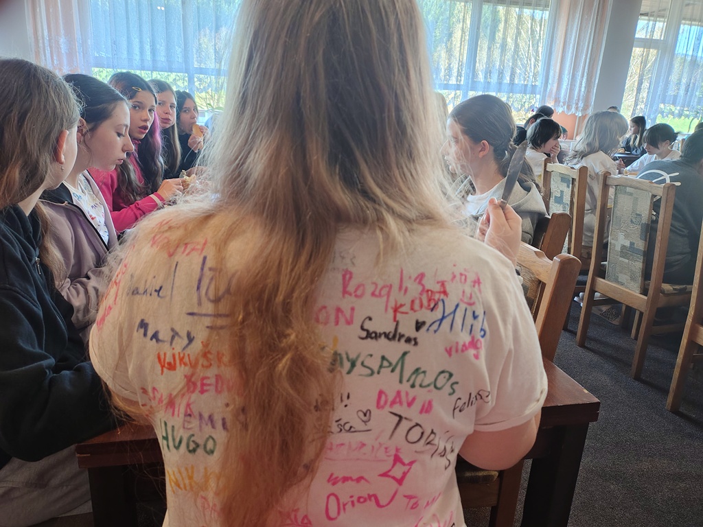 A právě snídaně měla dnes i symbolický nádech. Mladí kouzelníci dorazili oblečeni v tričkách, která si předchozí den sami vybarvili kouzelnickými motivy a postupně je zaplnili podpisy svých nových přátel i profesorů bradavické školy. Jídelna se tak proměnila v pestrou galerii vzpomínek a přátelství, které si každý ponese ještě dlouho po návratu domů.