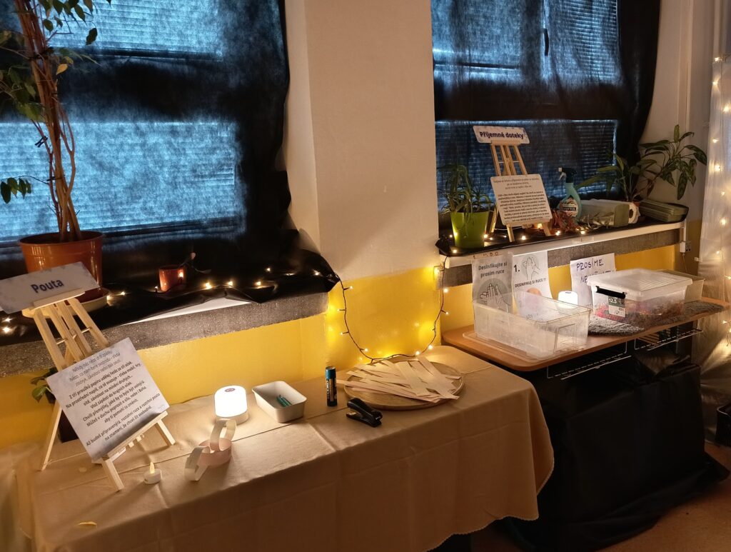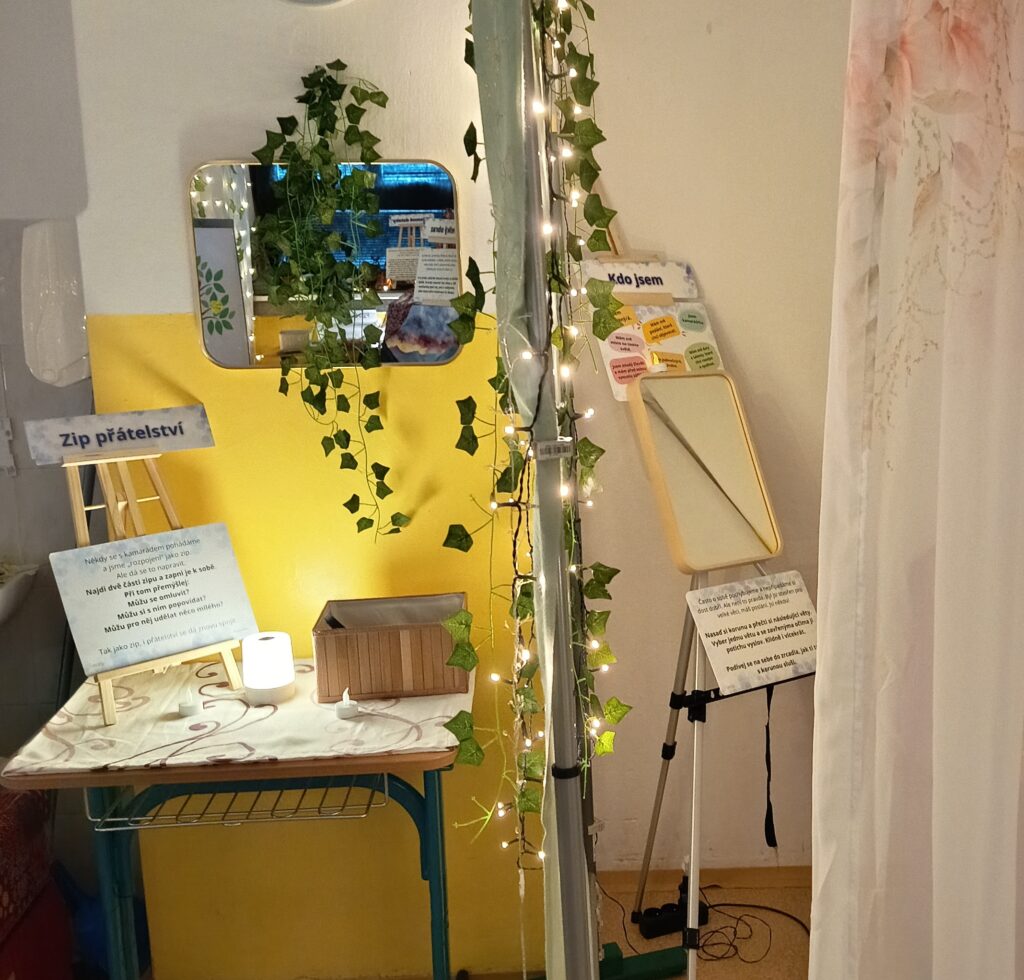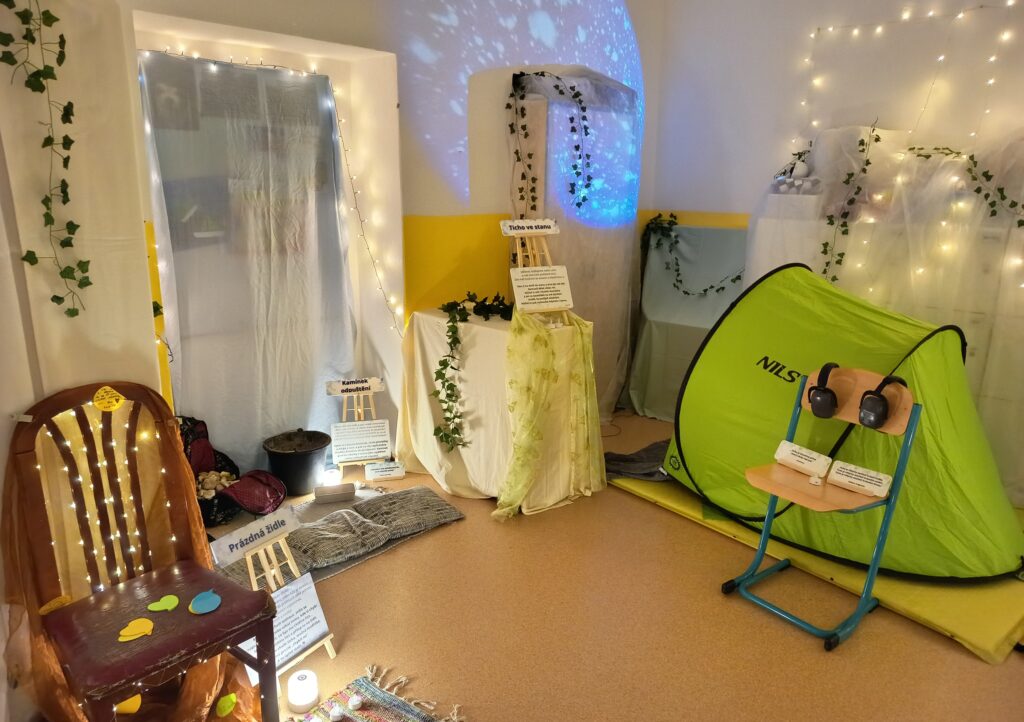 V krásném a klidném prostředí si žáci mohli podle vlastního výběru procházet různá stanoviště. Každé z nich nabízelo jiný způsob, jak si odpočinout, přemýšlet nebo vyjádřit své pocity.