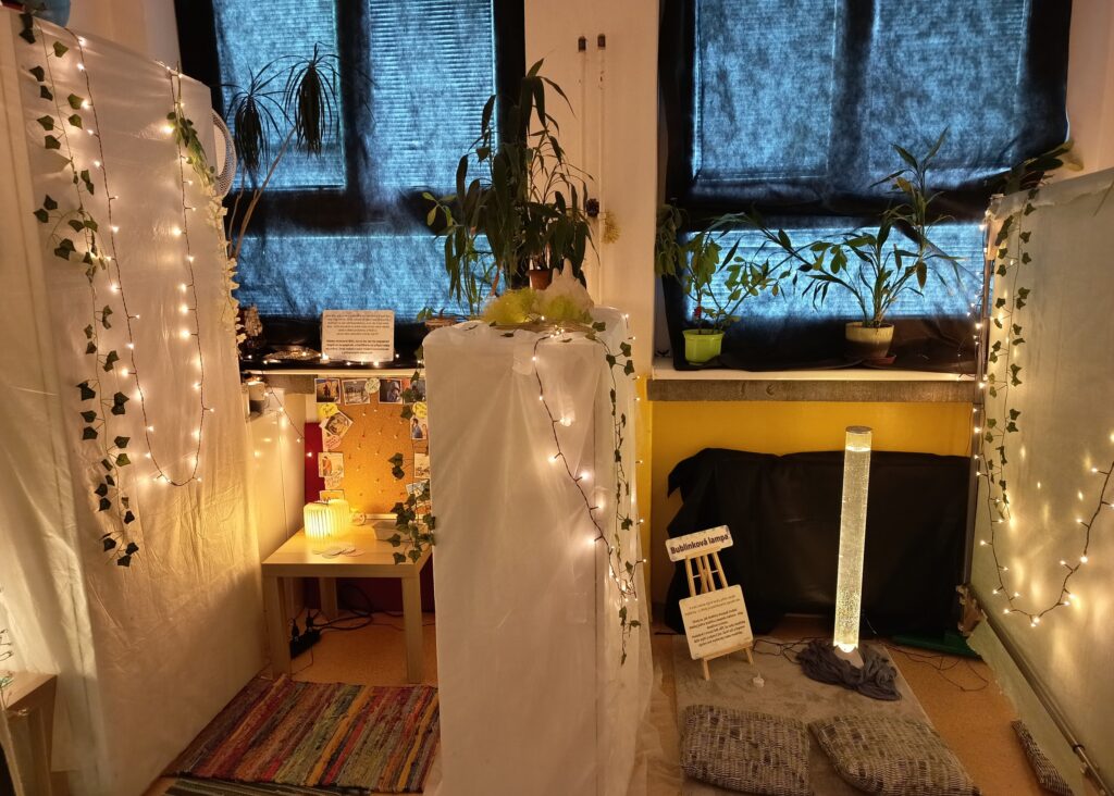 Byly to například Zeď nářků, kde mohli napsat své starosti nebo trápení a symbolicky je nechat za sebou. Na jiném stanovišti si mohli napsat na kamínek jméno toho, komu chtějí odpustit, hodili ho zpět do vody a tím udělat malý krok k usmíření. Ve stanu ticha si pak mohli nasadit sluchátka, pohodlně si lehnout a jednoduše si užít klid a ticho.