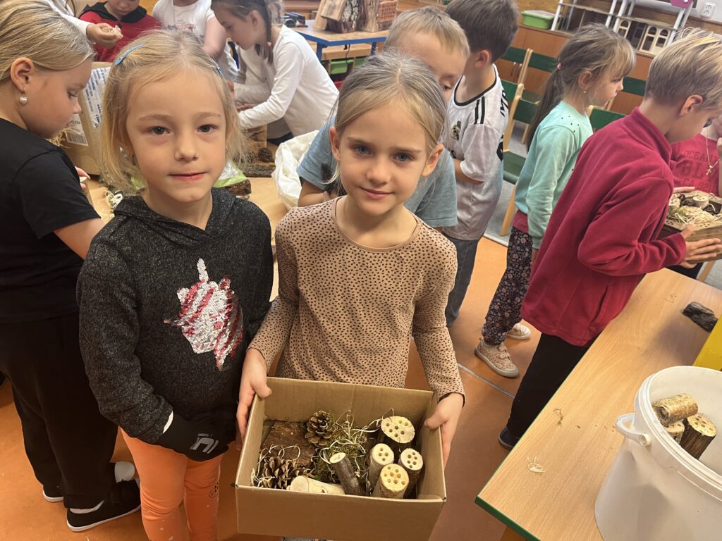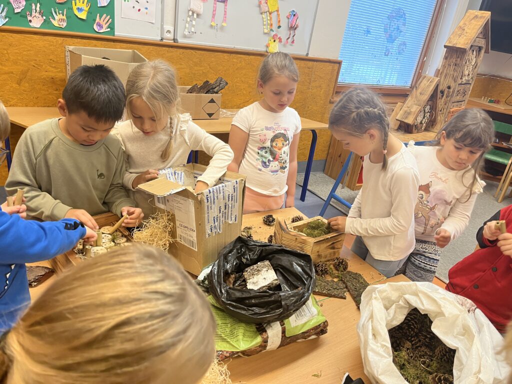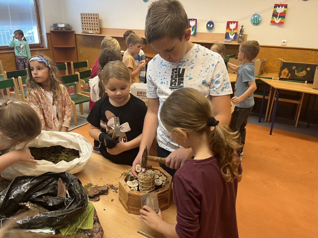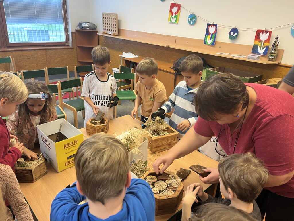 Včera se žáci ve školní družině s nadšením pustily do stavby hmyzího domečku. Nejprve si prohlédly obrázky broučků a povídaly si o jejich životě, poté zazněla i veselá písnička. Nakonec společně z přírodnin vytvořily nový domeček, který bude sloužit jako bezpečný úkryt pro drobný hmyz a připomene dětem, jak je důležité chránit přírodu.