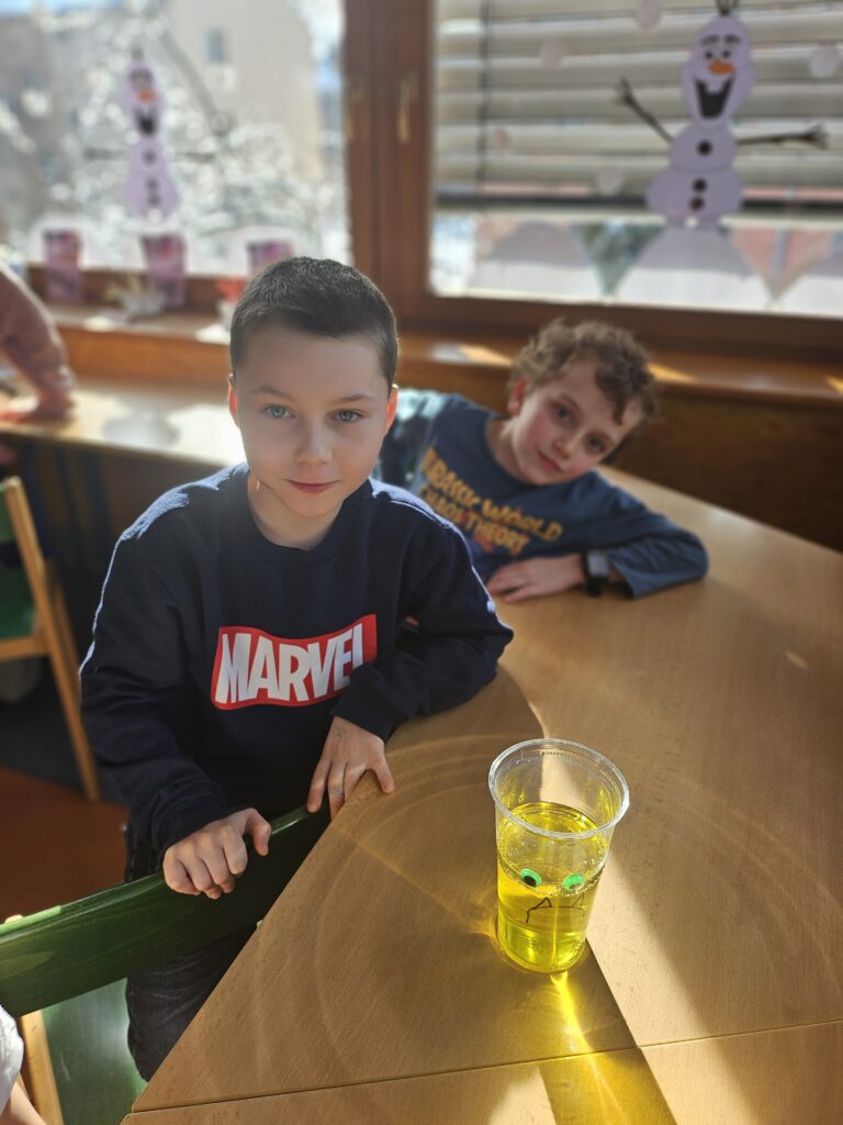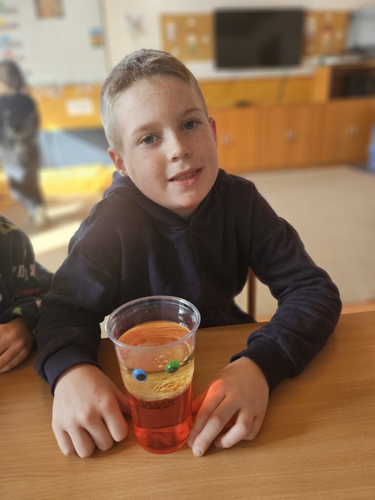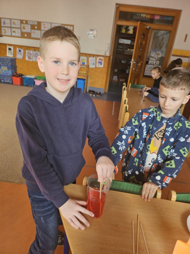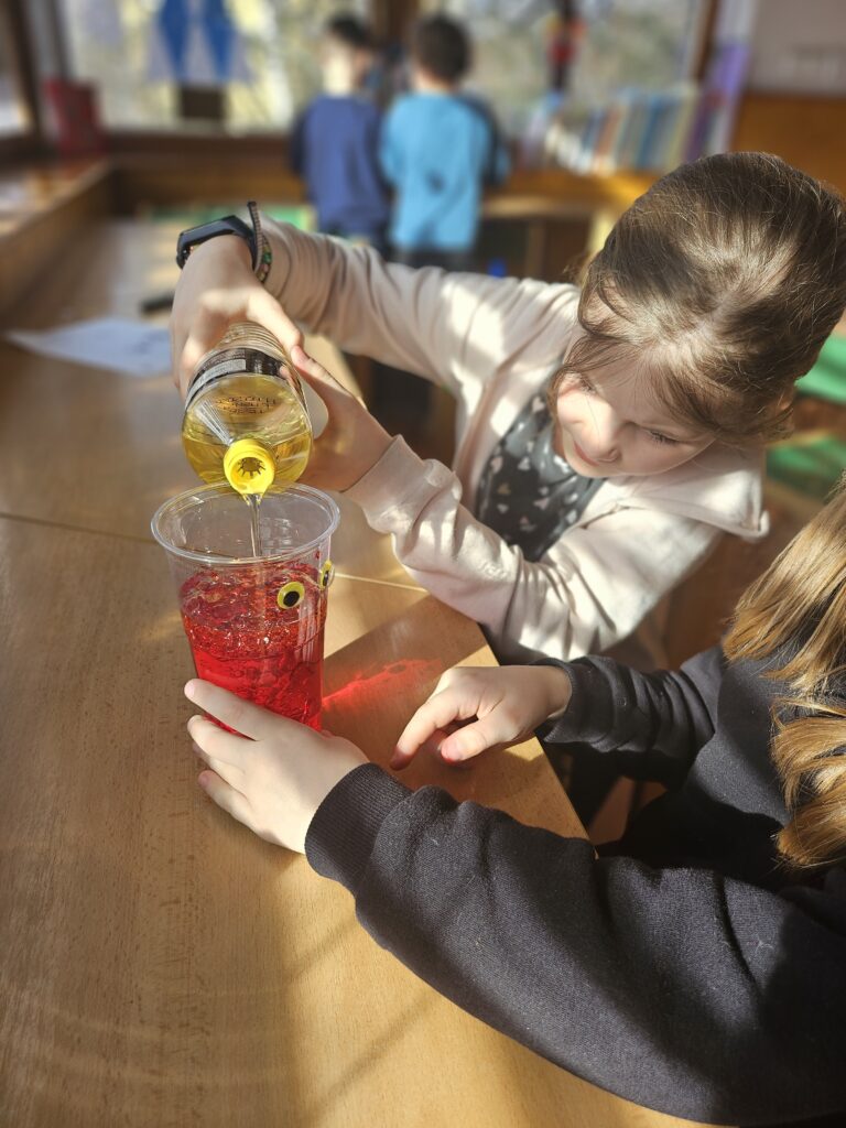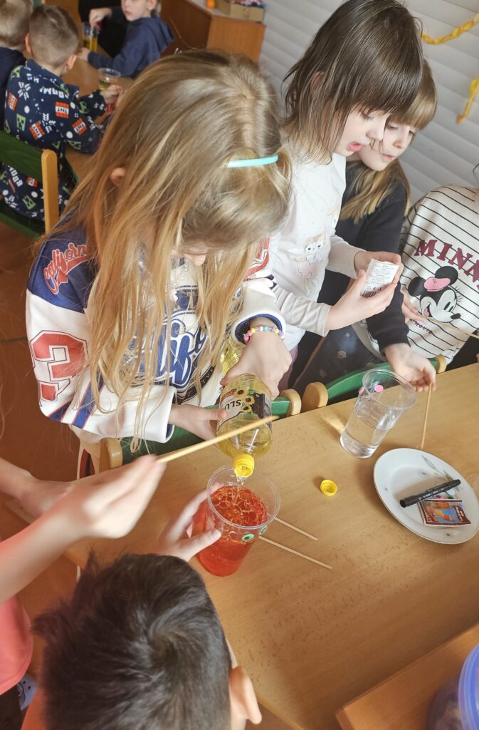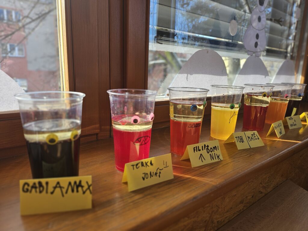 Děti zjistily, že voda a olej se nemíchají a vytvářejí vrstvy. Také viděly, jak při reakci tablety vzniká plyn, který nese barevnou vodu nahoru a pak zase klesá dolů.