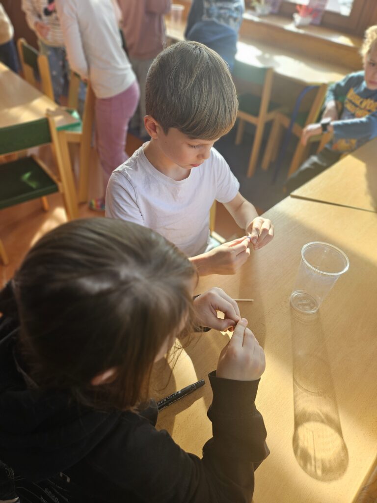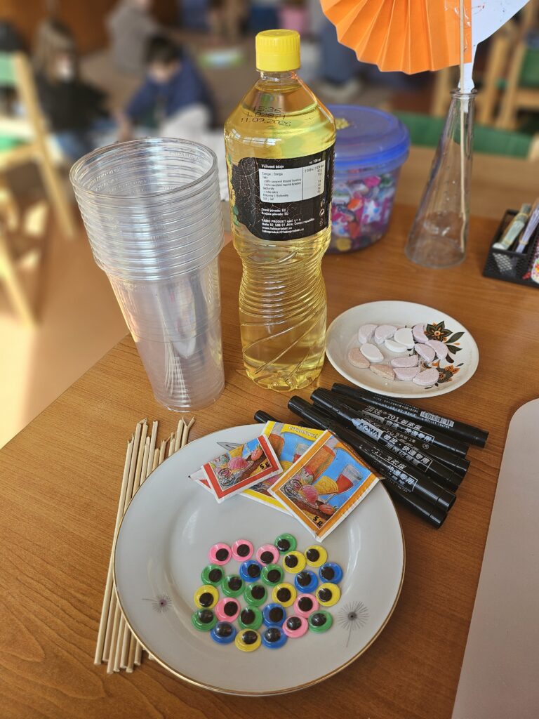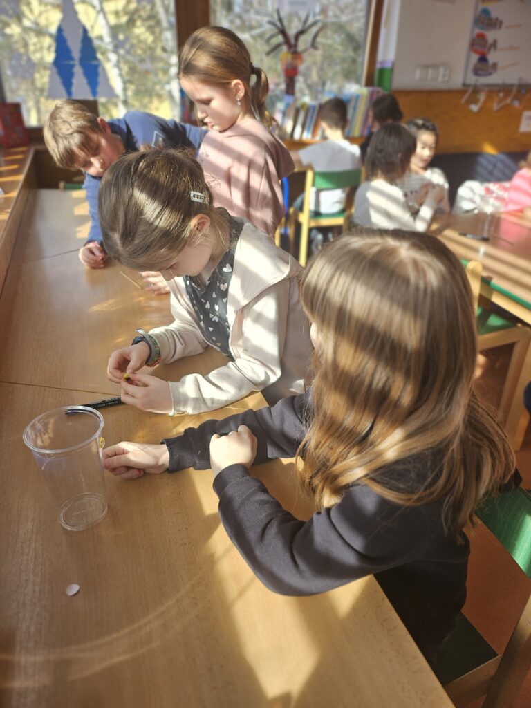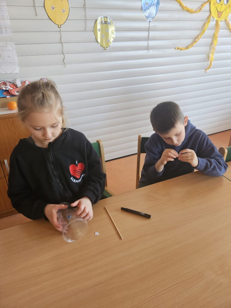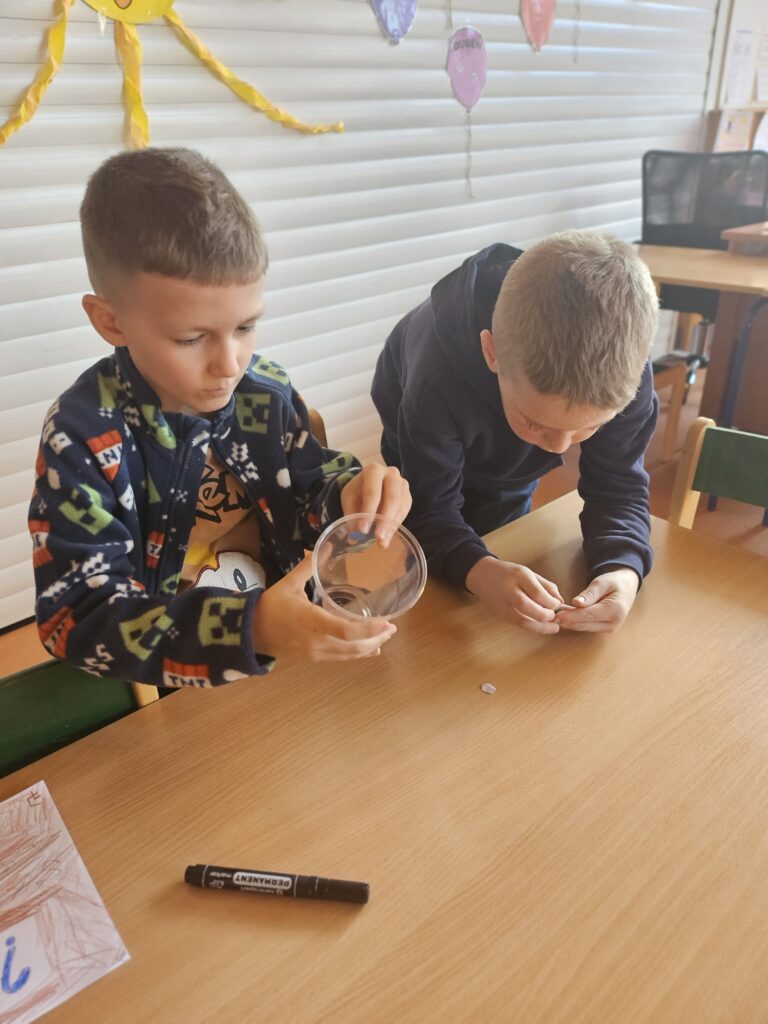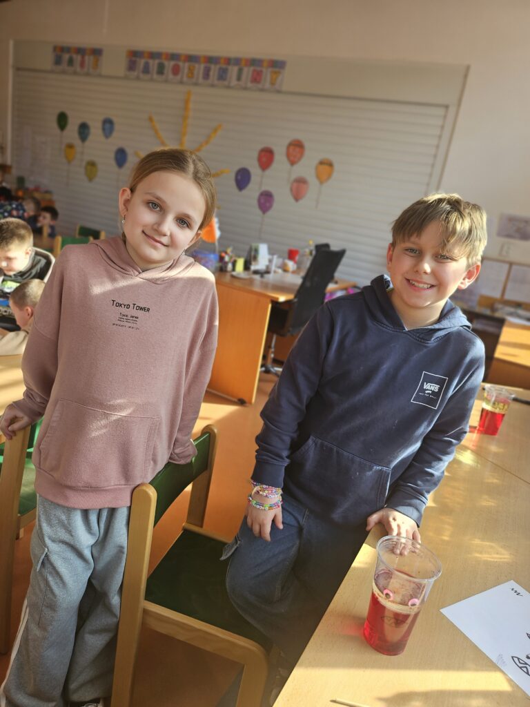 Děti zjistily, že voda a olej se nemíchají a vytvářejí vrstvy. Také viděly, jak při reakci tablety vzniká plyn, který nese barevnou vodu nahoru a pak zase klesá dolů.