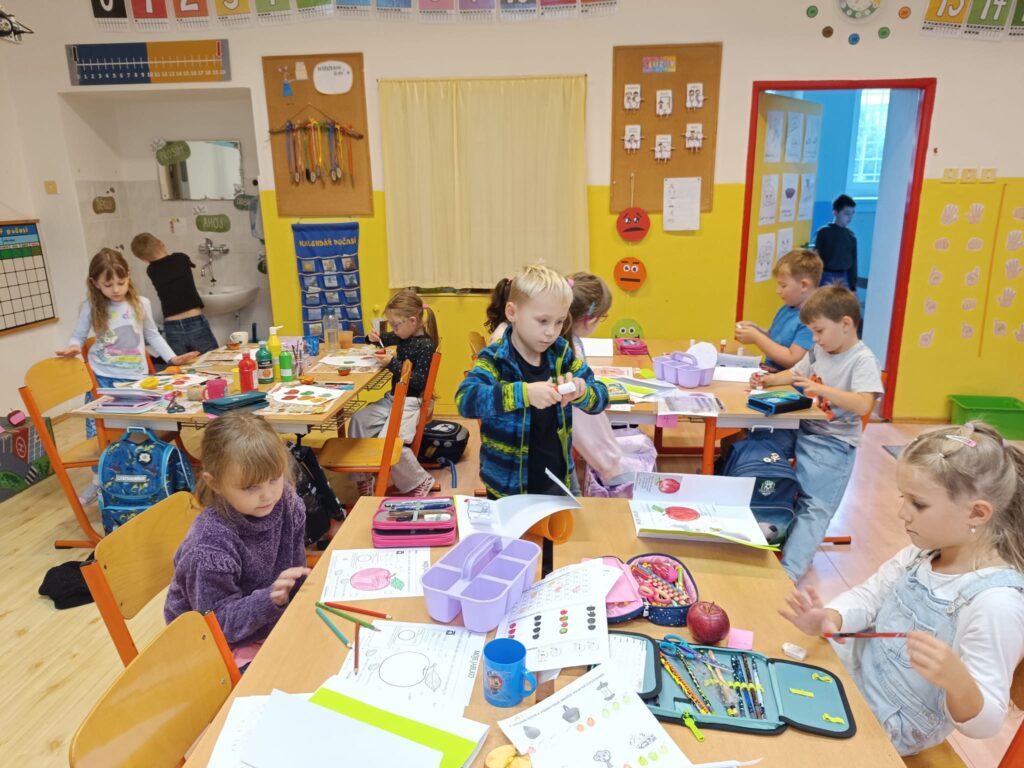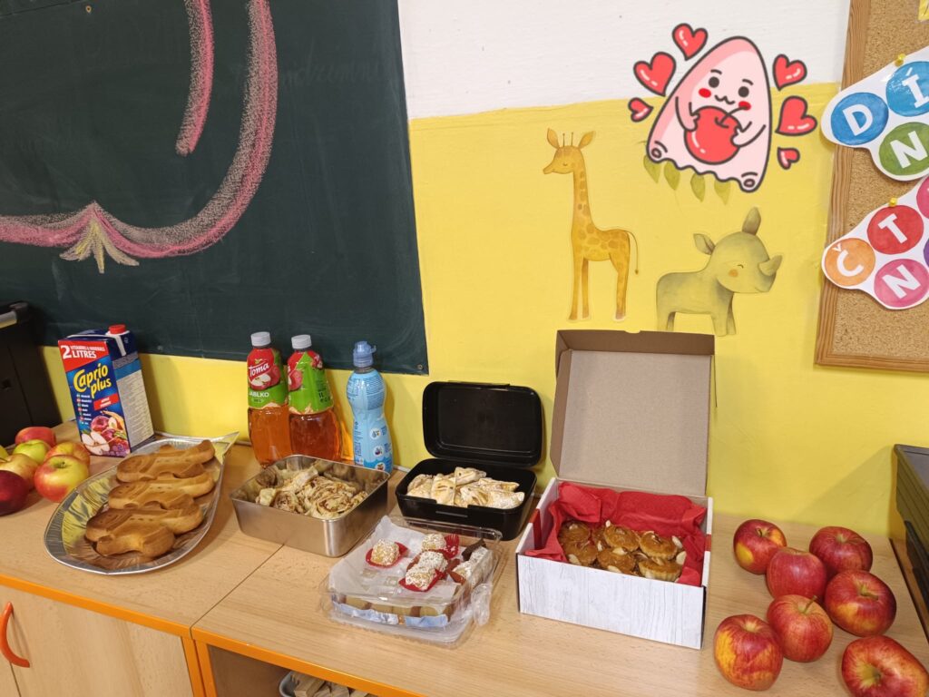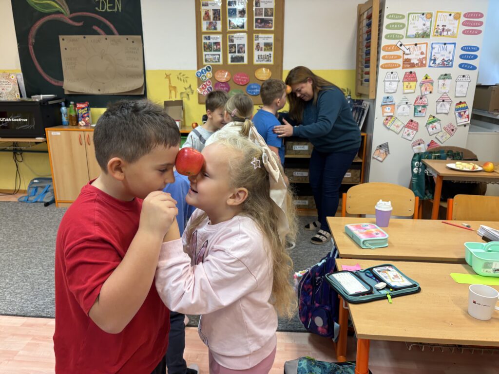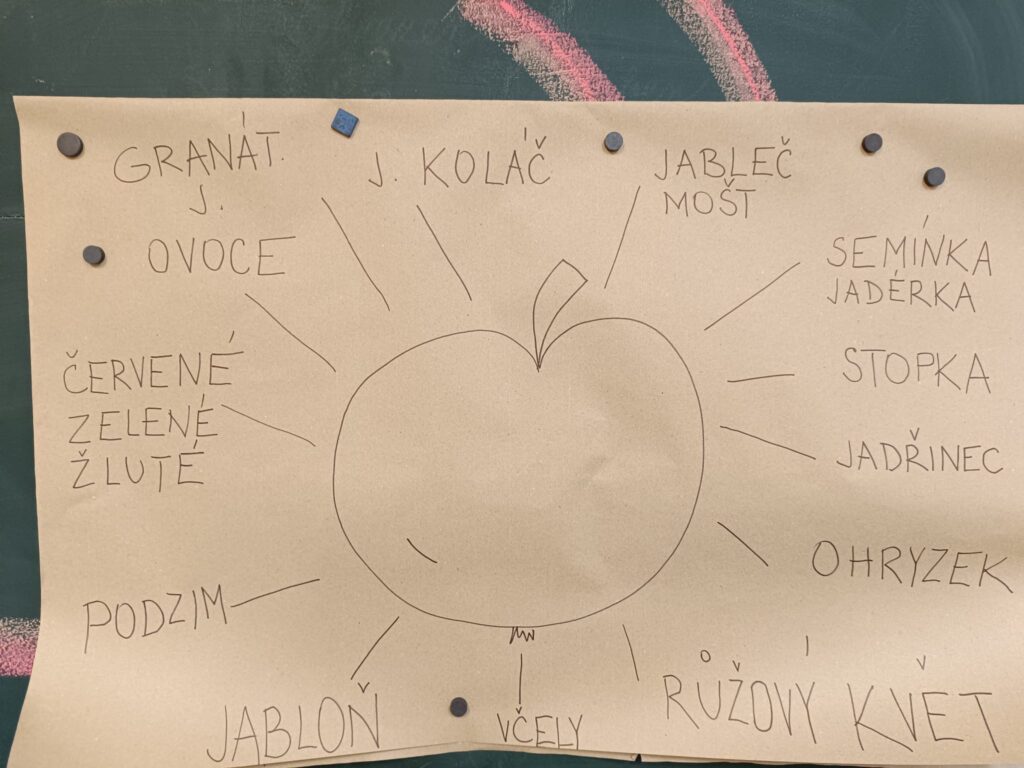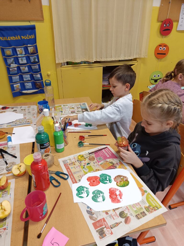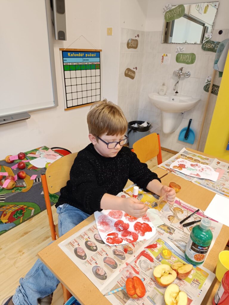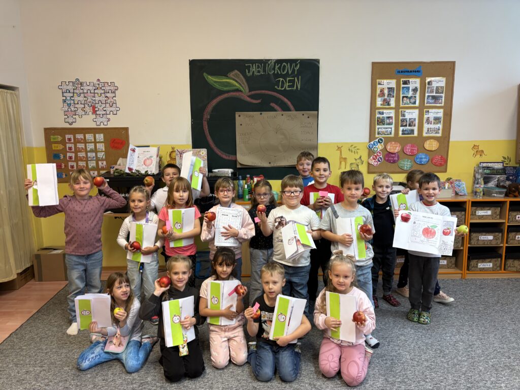 Pro začátek nás naladila pohádka „Příběh ukrytý v notách – čtvero ročních dob v jednom dni“. Poté jsme společně vymýšleli, co všechno o takovém jablku vlastně víme a vytvořili jsme si jednoduchou myšlenkovou mapu. Předvedli jsme si svá donesená naleštěná jablka, pozorovali jejich tvar, barvu, vůni a dozvěděli jsme se plno zajímavostí. V průběhu dopoledne jsme ve skupinách plnili nejrůznější pracovní listy, kde jsme se seznámili se životním cyklem jablka od semínka po zralý plod, procvičili si již naučená písmena, obtiskovali jsme jablíčka a nezapomněli ani na počítání.  Celý den měly děti možnost ochutnávat různé koláčky, štrůdly, šátečky, mošt a křížaly.
