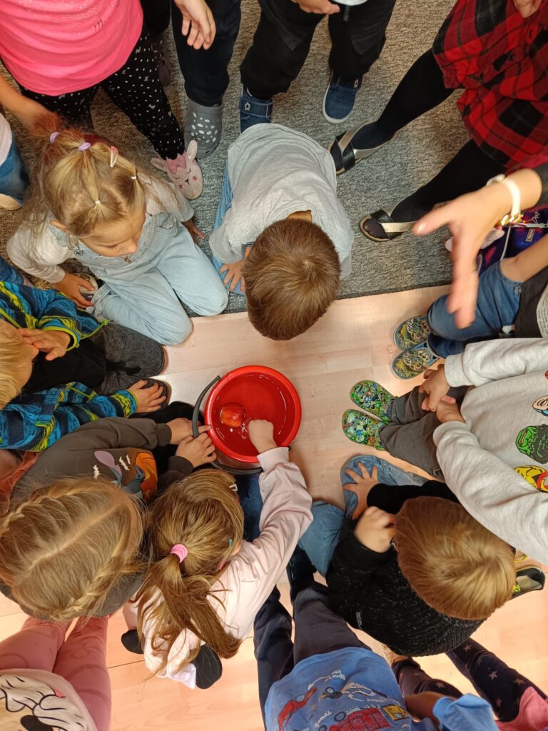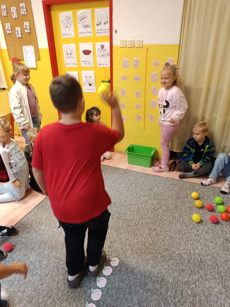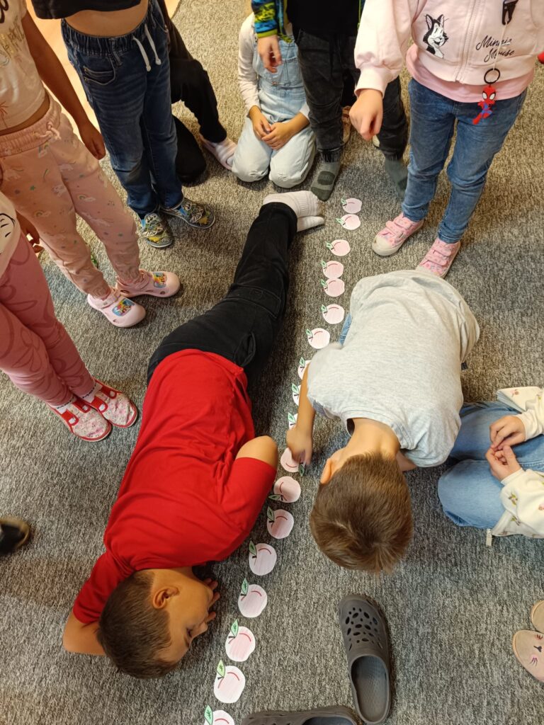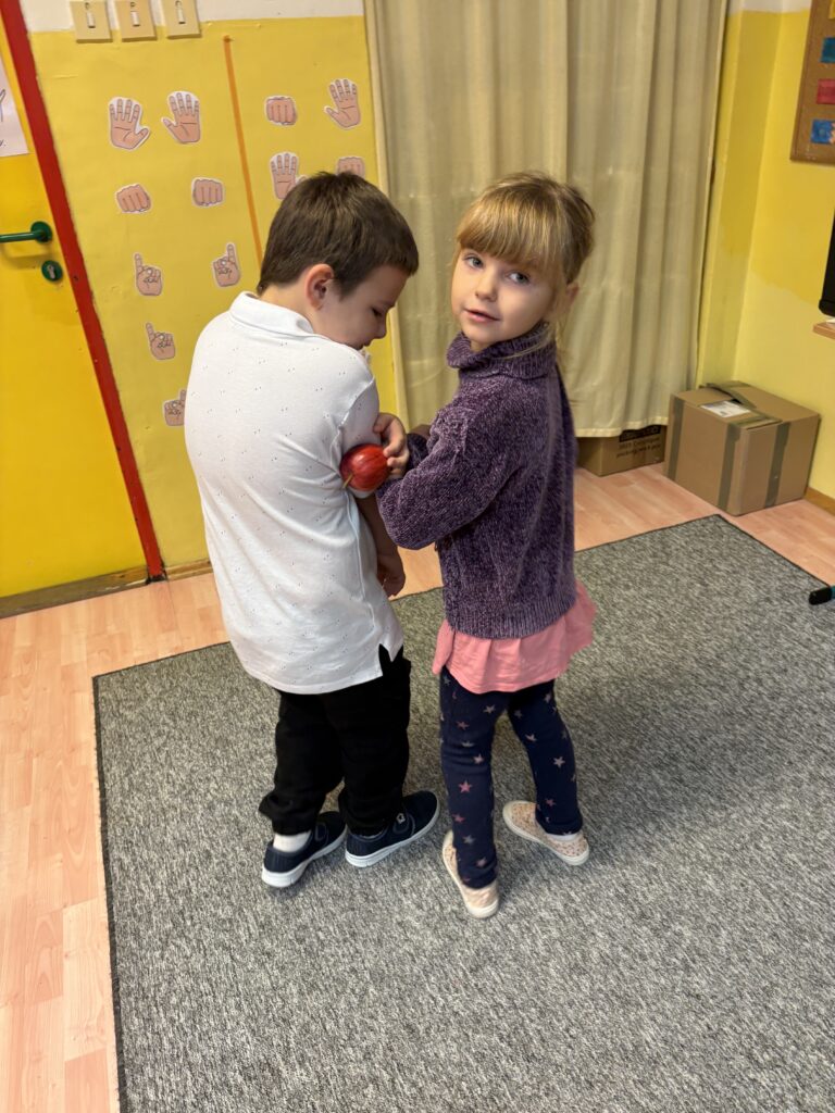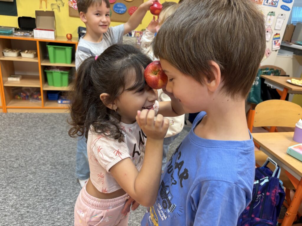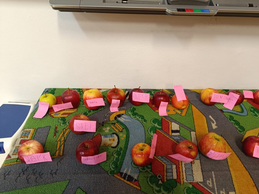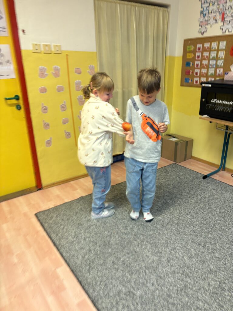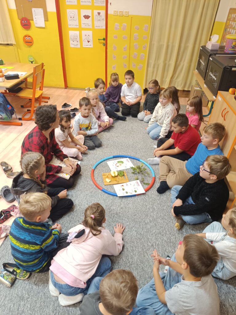 Pro začátek nás naladila pohádka „Příběh ukrytý v notách – čtvero ročních dob v jednom dni“. Poté jsme společně vymýšleli, co všechno o takovém jablku vlastně víme a vytvořili jsme si jednoduchou myšlenkovou mapu. Předvedli jsme si svá donesená naleštěná jablka, pozorovali jejich tvar, barvu, vůni a dozvěděli jsme se plno zajímavostí. V průběhu dopoledne jsme ve skupinách plnili nejrůznější pracovní listy, kde jsme se seznámili se životním cyklem jablka od semínka po zralý plod, procvičili si již naučená písmena, obtiskovali jsme jablíčka a nezapomněli ani na počítání.  Celý den měly děti možnost ochutnávat různé koláčky, štrůdly, šátečky, mošt a křížaly.