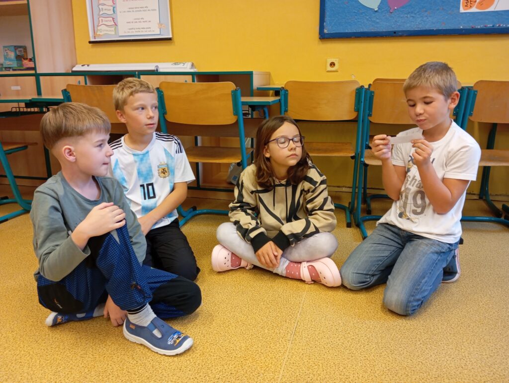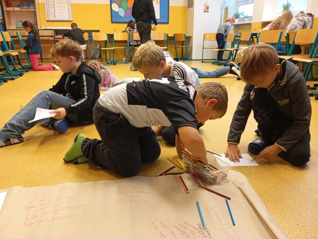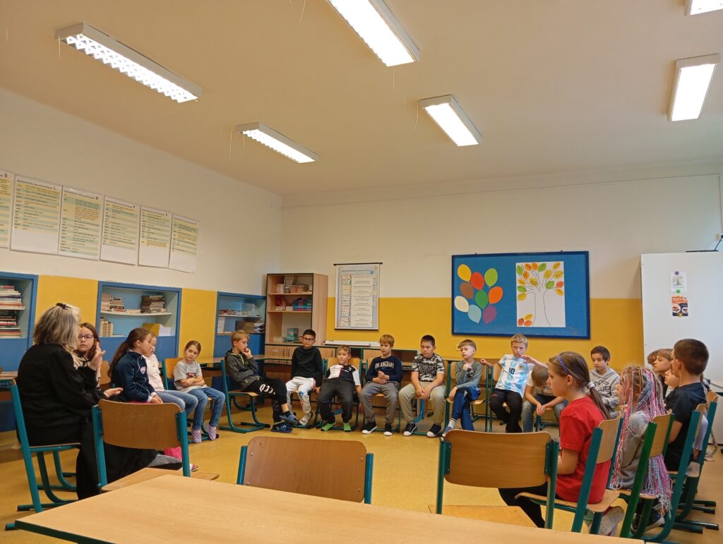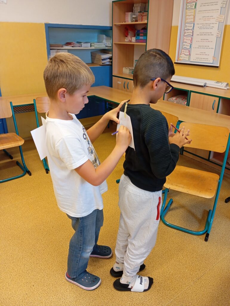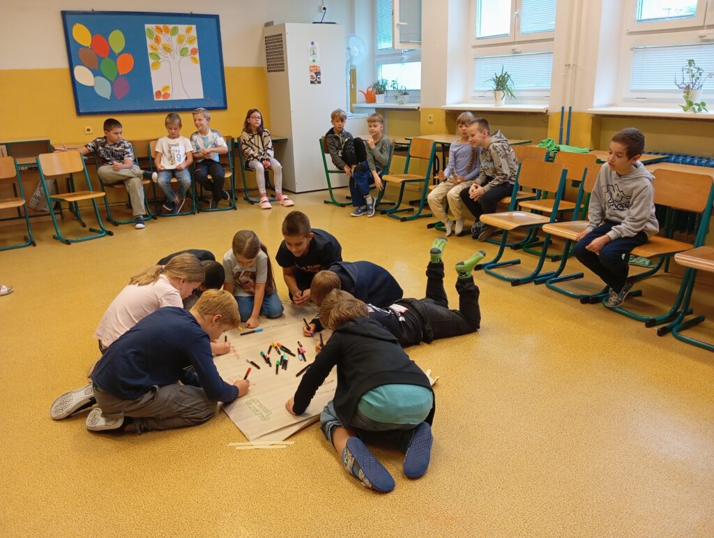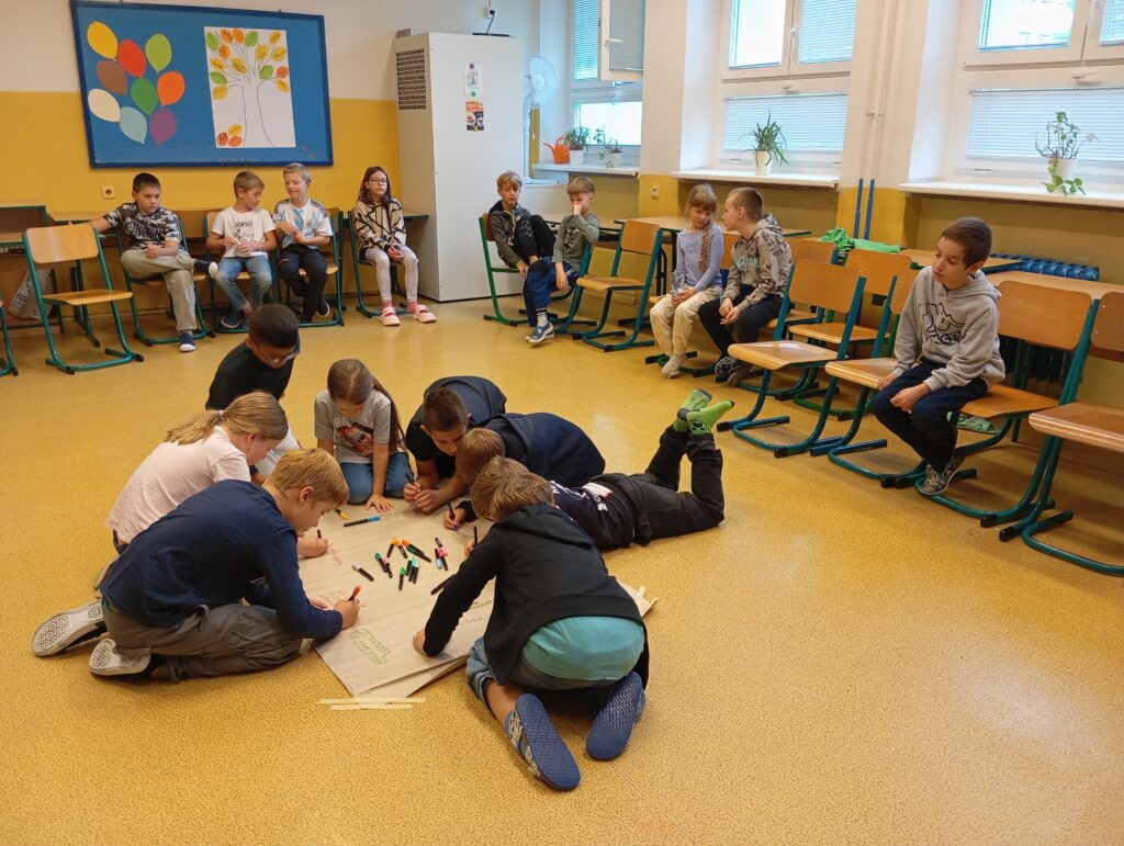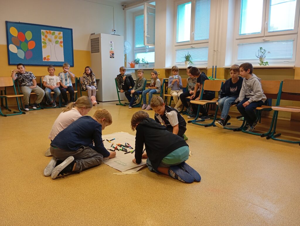 Dne 24. září naši třídu navštívili Jitka a Jindra z Theatr Ludem s programem Včelí kolektiv. Zuzana B. Rozdělili jsme se do skupin. Nikita S. Ve Včelím kolektivu jsme si hráli na včely a Jindřich byl sršeň. Nikolas P. Když se na nás koukal, nesměli jsme se hýbat. Jirka R. Když jsme se pohli a sršeň nás viděl, tak jsme si měli sednout. Beáta P. Byli jsme mrtví. Jirka R. Když byl sršeň otočený, tak jsme měli utíkat. Patrik G. Měli jsme vzít zrnko. Mirka Č. Potom jsme museli jít s tím pilovým zrnkem zpátky do včelího ráje. Radan K. Když ten sršeň někoho chytil, museli jsme ho zachránit. Václav A. Mě nejvíc bavilo, že jsme zachraňovali Hanku. Veronika V. Otrávené včely zachránili a to mě nejvíc bavilo. Hana L. V zrníčkách pilu byly nápisy poslání včel. Rozdělovali jsme se podle poslání včel. Názvy včel: létavky, krmičky, stavitelky, kojičky, čističky. Beáta P. Já jsem byl skupina stavitelky a byl jsem s Vaškem a Ráďou. Matouš H. Pak jsme si říkali, co by se stalo, kdybychom nebyli. Mirka Č. Uvědomili jsme si, že kdybychom tady nebyli, tak by polovina včel nepřežila. Elizabeth P. Ještě jsme psali, co máme rádi ve třídě nebo nemáme rádi. Uliana T. Měli jsme napsat kamarádovi, jaký je. Tomáš S. Nejvíc se mi líbilo, jak jsme malovali orgány. Nikola G. Třeba srdce, ruku, nohu, oči, pusu. Já jsem kreslil srdce, protože jsem kamarádský. Nikolas P. Z jednotlivých částí těla jsme vytvořili společný organismus naší třídy. Každý v něm je potřebný. Slávka B.