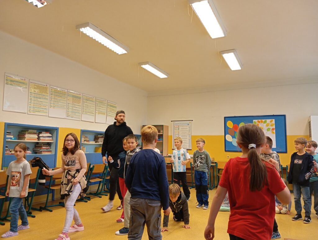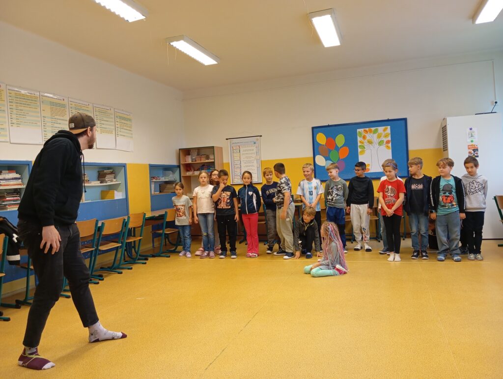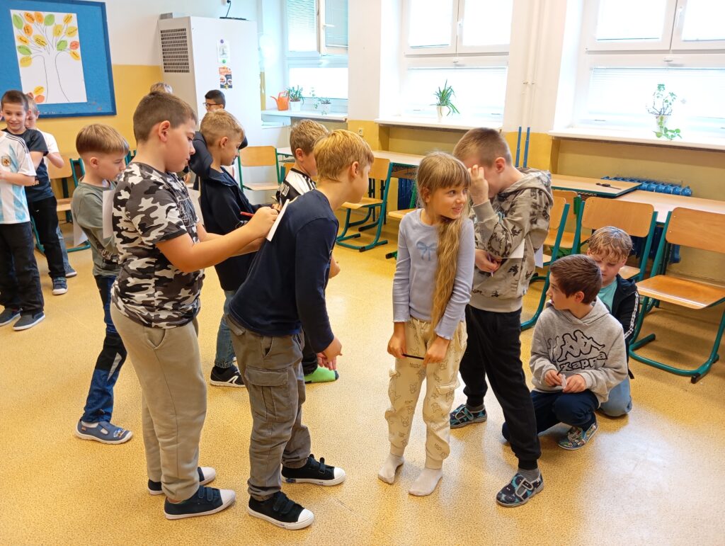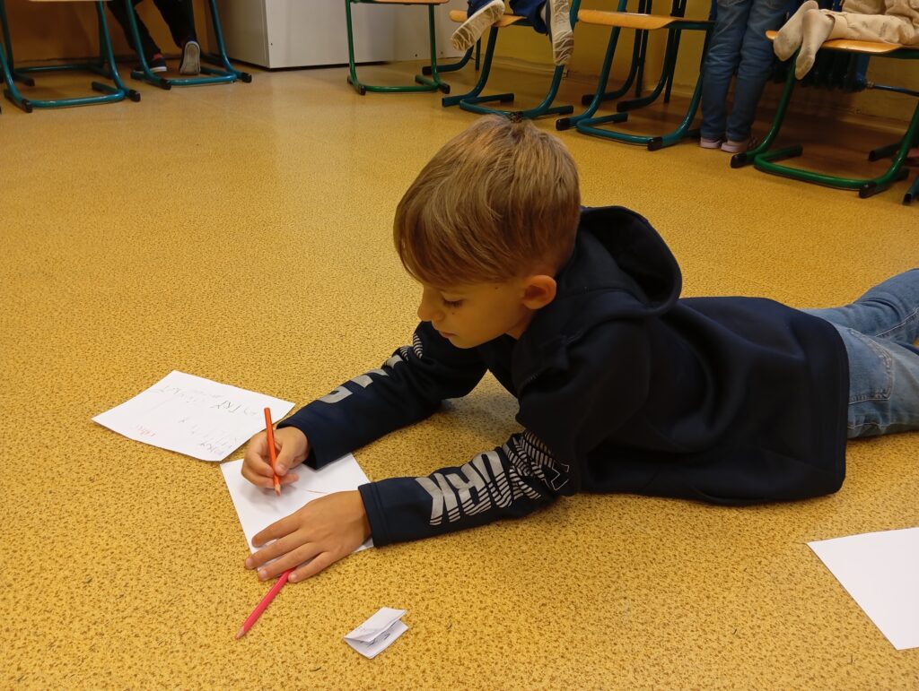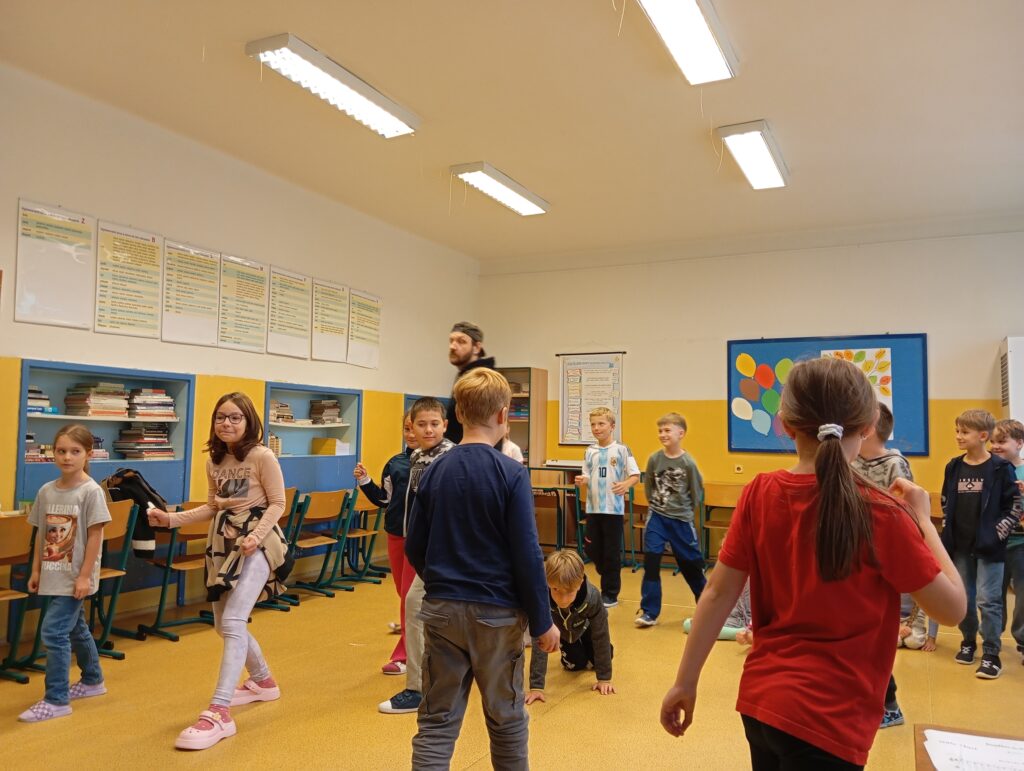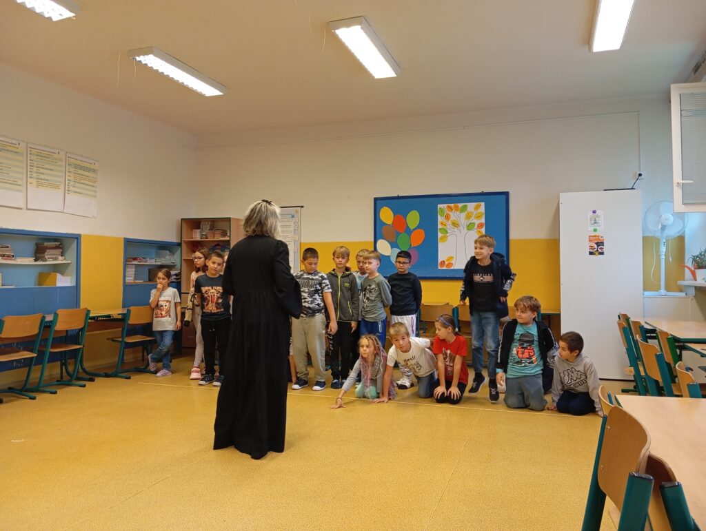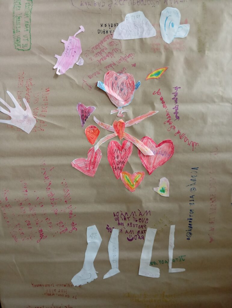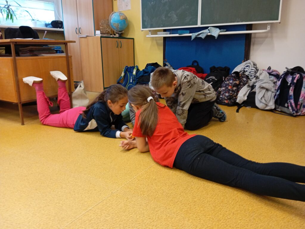 Dne 24. září naši třídu navštívili Jitka a Jindra z Theatr Ludem s programem Včelí kolektiv. Zuzana B. Rozdělili jsme se do skupin. Nikita S. Ve Včelím kolektivu jsme si hráli na včely a Jindřich byl sršeň. Nikolas P. Když se na nás koukal, nesměli jsme se hýbat. Jirka R. Když jsme se pohli a sršeň nás viděl, tak jsme si měli sednout. Beáta P. Byli jsme mrtví. Jirka R. Když byl sršeň otočený, tak jsme měli utíkat. Patrik G. Měli jsme vzít zrnko. Mirka Č. Potom jsme museli jít s tím pilovým zrnkem zpátky do včelího ráje. Radan K. Když ten sršeň někoho chytil, museli jsme ho zachránit. Václav A. Mě nejvíc bavilo, že jsme zachraňovali Hanku. Veronika V. Otrávené včely zachránili a to mě nejvíc bavilo. Hana L. V zrníčkách pilu byly nápisy poslání včel. Rozdělovali jsme se podle poslání včel. Názvy včel: létavky, krmičky, stavitelky, kojičky, čističky. Beáta P. Já jsem byl skupina stavitelky a byl jsem s Vaškem a Ráďou. Matouš H. Pak jsme si říkali, co by se stalo, kdybychom nebyli. Mirka Č. Uvědomili jsme si, že kdybychom tady nebyli, tak by polovina včel nepřežila. Elizabeth P. Ještě jsme psali, co máme rádi ve třídě nebo nemáme rádi. Uliana T. Měli jsme napsat kamarádovi, jaký je. Tomáš S. Nejvíc se mi líbilo, jak jsme malovali orgány. Nikola G. Třeba srdce, ruku, nohu, oči, pusu. Já jsem kreslil srdce, protože jsem kamarádský. Nikolas P. Z jednotlivých částí těla jsme vytvořili společný organismus naší třídy. Každý v něm je potřebný. Slávka B.